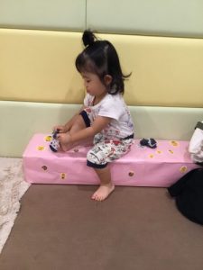 靴下を脱いだり、エプロンとタオルを所定の場所に入れに行きます