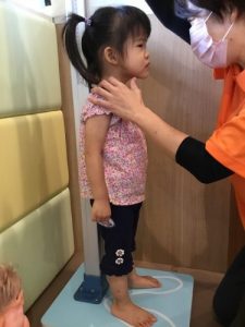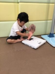 まだしっかり立ってはかれないもも組のお友だちは寝転んではかりますよ