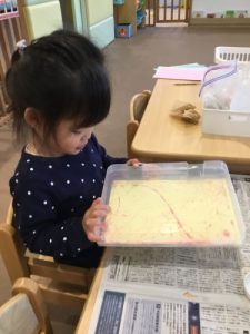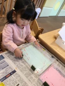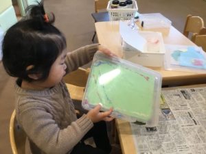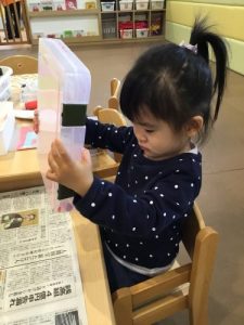 ケースの中に絵の具のついたビー玉を入れてコロコロと振って色付けしました。