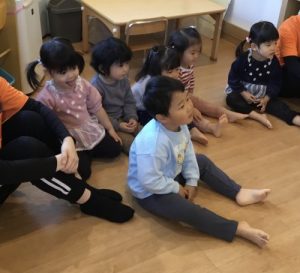 体を大きく伸ばしたり、小さく丸めたり、楽しみながらしなやかな動きができるようにしていきます。