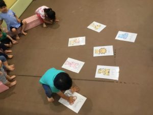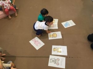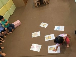 カードをカルタのように床に並べて保育士が英語で動物名を言った後に子どもがタッチするゲームをします。