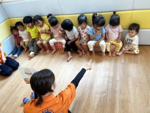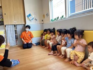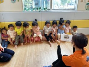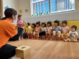 保育士が持ってきた箱を見て、「あれは何?」「何が入ってるの?」と興味津々のお友だち。