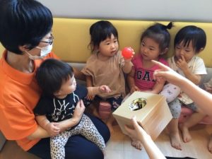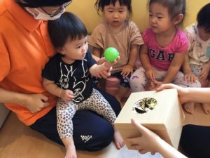 次はひとりずつ箱に手を入れて、取り出したボールの色を答えていくゲームです💓