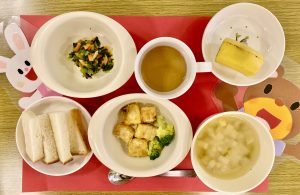 給食の様子を見に行くと、夢中になって給食を食べていた子どもが顔をあげ、「せんせい、おいしい!」と声をかけてくれました!保育園での給食を子どもたちは、とてもおいしそうに食べてくれています!
