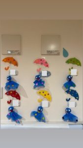 てるてる坊主の体にシールを貼って模様をつけたよ!