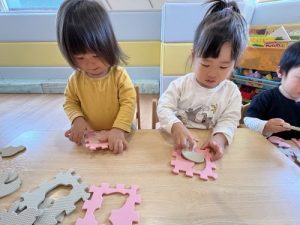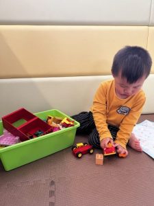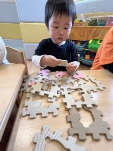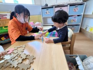 保育者が話しかけても夢中でブロック遊びをしていますよ!