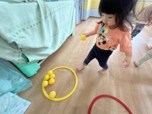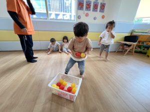 保育士が「yellow ball🟡」と言葉だけで子どもたちに伝えると、2色入ったボックスから黄色のボールを選び、同じ黄色のフープ内に入れにいきます💨