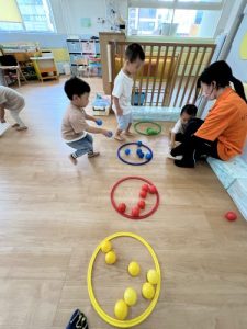 いちご組のお友だちも迷いながらも黄色のボールを選択してテクテクとフープ内に入れにいくではありませんか‼️