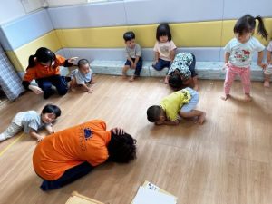 この日は地震が起きた時に頭を守るポーズ『ダンゴムシ』を子どもたちに伝えました。