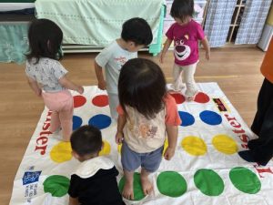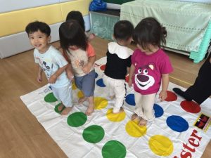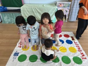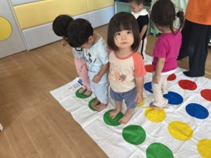 保育士の「green🟢」の掛け声に合わせて、床のマークの上に立ちます。