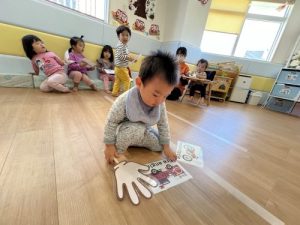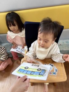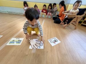 もも組のお友だちは英語で「bus🚌」を伝えながら一緒にタッチ🖐️