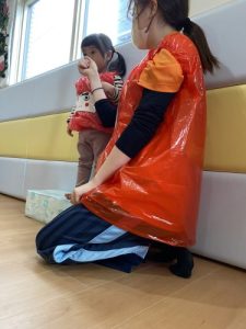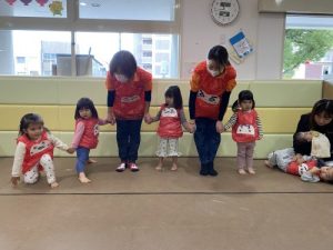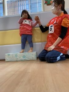絵本が完成し、みんなも「だるまさん」に、なってみよーう!