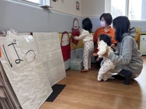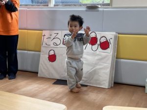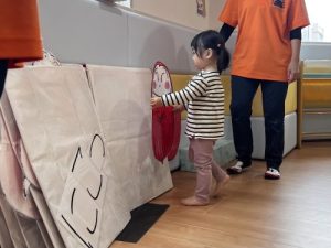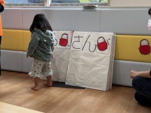 「だるまさんが」の大型絵本を子どもたちに完成させてもらいました。