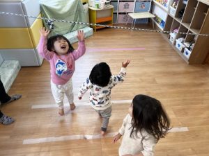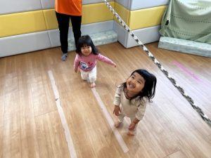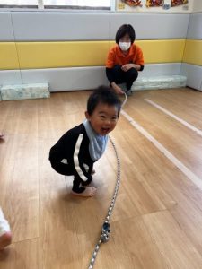 まずは子どもたちの身長より少し高い位置にあるロープにタッチ![]()