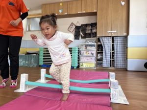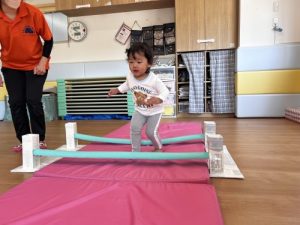 両足跳びはまだ難しいですが片足ずつ障害物を避けていました👏