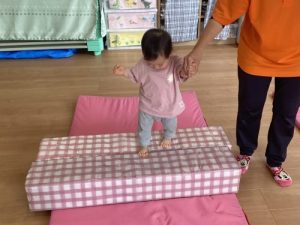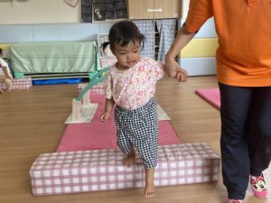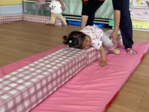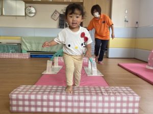まずは平均台を熊さん歩きで跨いで歩きます。