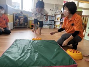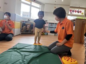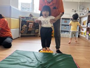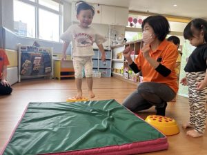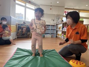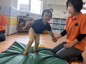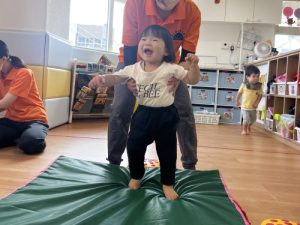 もも組さんは保育者が体幹を支えてジャンプ。