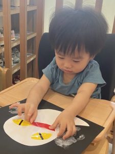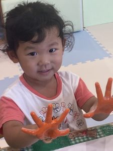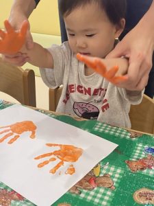 2歳児さんはオレンジ色を使って手形を取りました🖐️