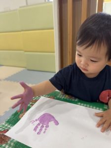 1歳児さんは紫色を使って手形を取っていましたよ🖐️