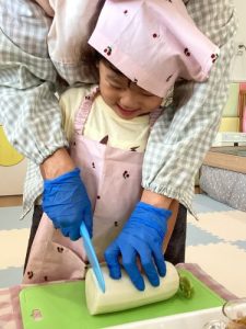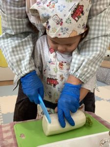 2歳児さんは大きな大根を使って食育を行いました。
