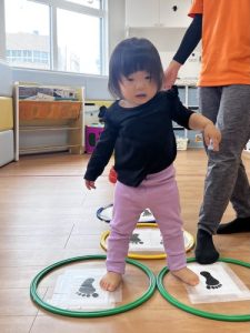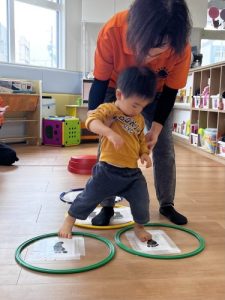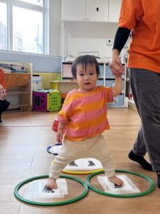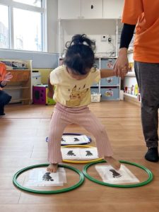 保育者と手を繋いで両足ジャンプをして片足ずつ着地できていますね👏