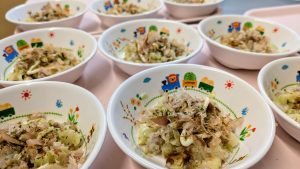 いただきますのご挨拶をする前に「給食いっぱい食べる」「お肉いっぱい食べようね!」「ぜーんぶおかわりする!」など会話が盛り上がっていました。会話を聞いていると、時々大人顔負けなことを言っている子どもたちです♪