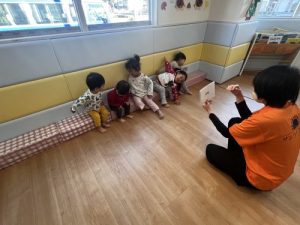 ドッグ、キャット、ライオンなど、色んな動物たちを保育者に続いて英語でお話ししています!
