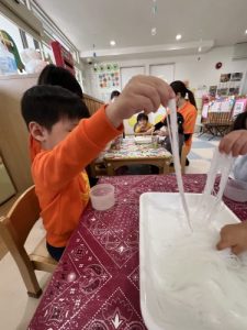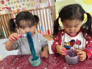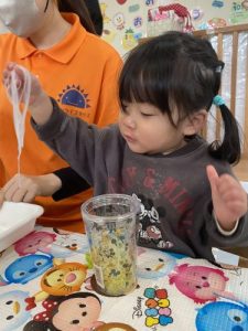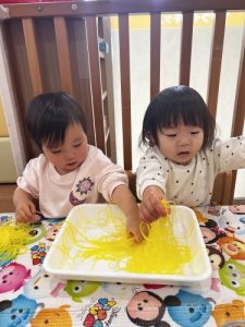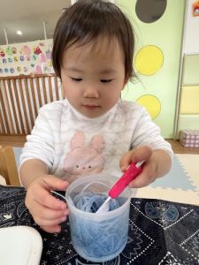 夏の暑い時期に冷たい冷たい春雨を使って春雨遊びを行いました!