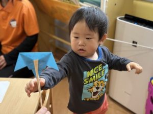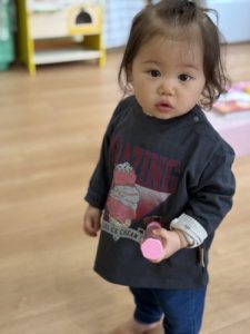 パパやママと別れてから泣いてしまうこともありましたが、入園進級おめでとう会🥳で保育者の出し物を見ていると興味津々の表情をしていました。