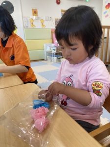 ピンクとブルーのお花紙を小さく丸めて、袋に入れて