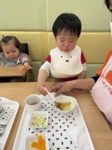 そんな陽気の中、慣れ保育も終わり初めての給食にチャレンジしていたお友だちご紹介したいと思います。