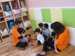 こちらでは、先生に絵本を読んでもらっています![]()