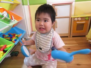 まだまだ、ごっこ遊びは難しいですが、おままごとの調理器具や、お野菜などに興味を持って遊んでいます。