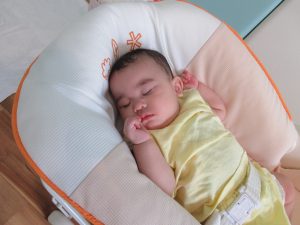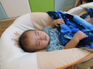 起きてからは、腹ばいになって遊んだり、先生とふれあい遊びを楽しんでいます。