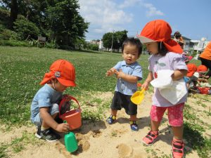 サラサラとした砂の感触を楽しんだり、スコップですくってバケツに入れて…の繰り返し遊びを楽しみました♪