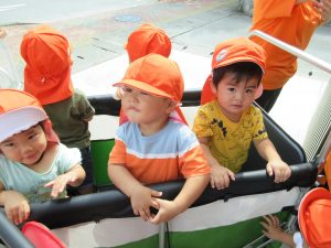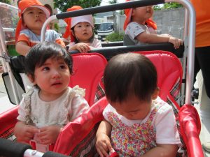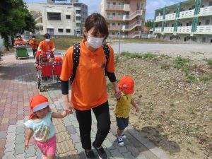 りんご組さんは順番に立ち乗りバギーから降りて、先生と手を繋いで歩いていますよ![]()
