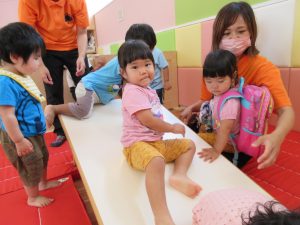 時々、設定するすべり台。その準備をしている間、子どもたちは嬉しそうに待っています。