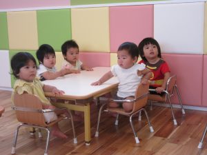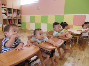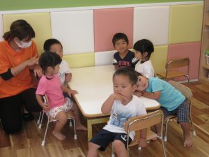 みんなで一緒におやつを食べる準備をして、テーブルにつきました。