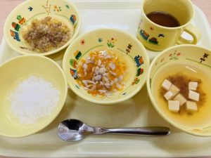 粥 すまし汁 魚と人参の煮物 キャベツのおかか煮