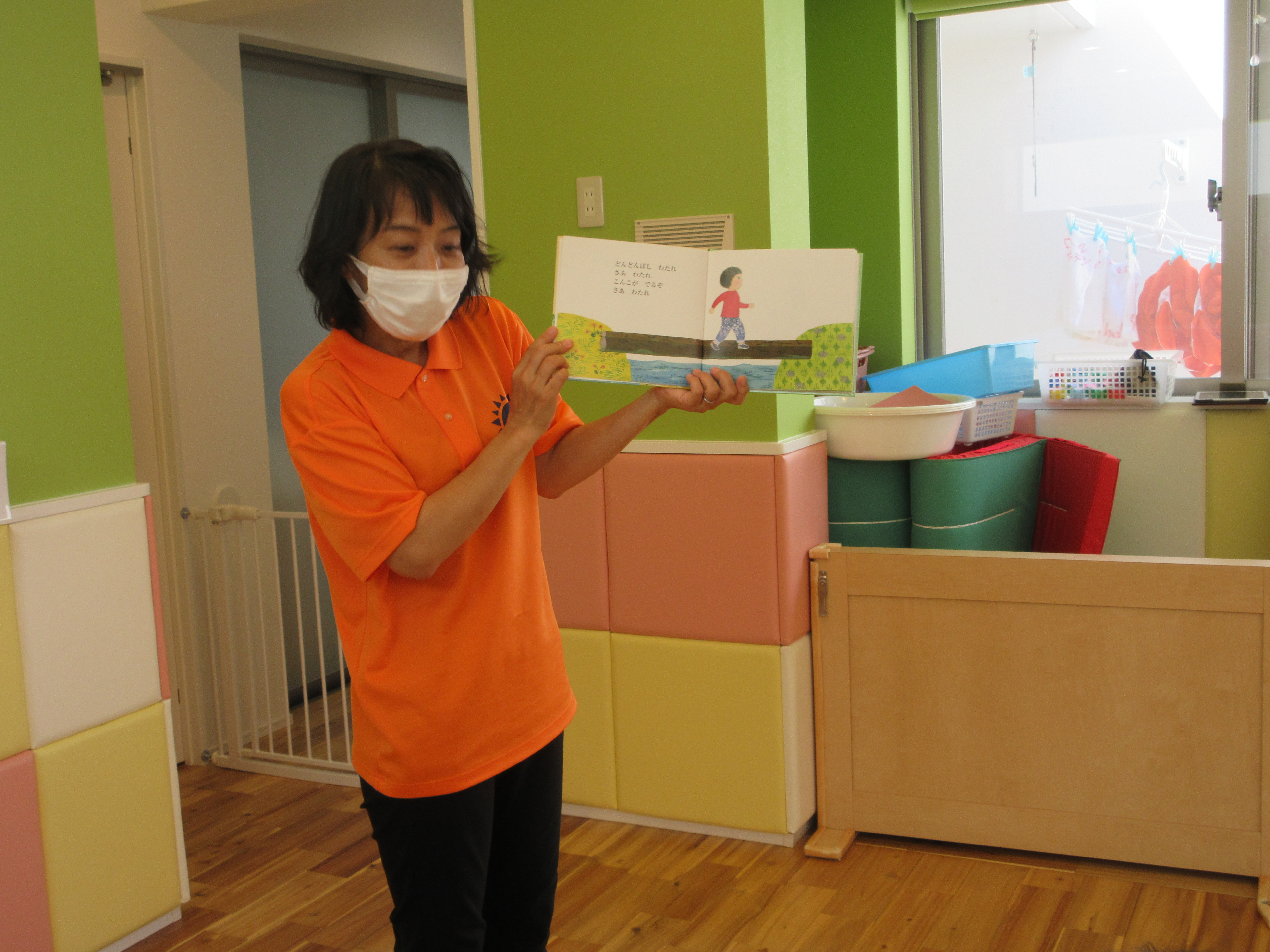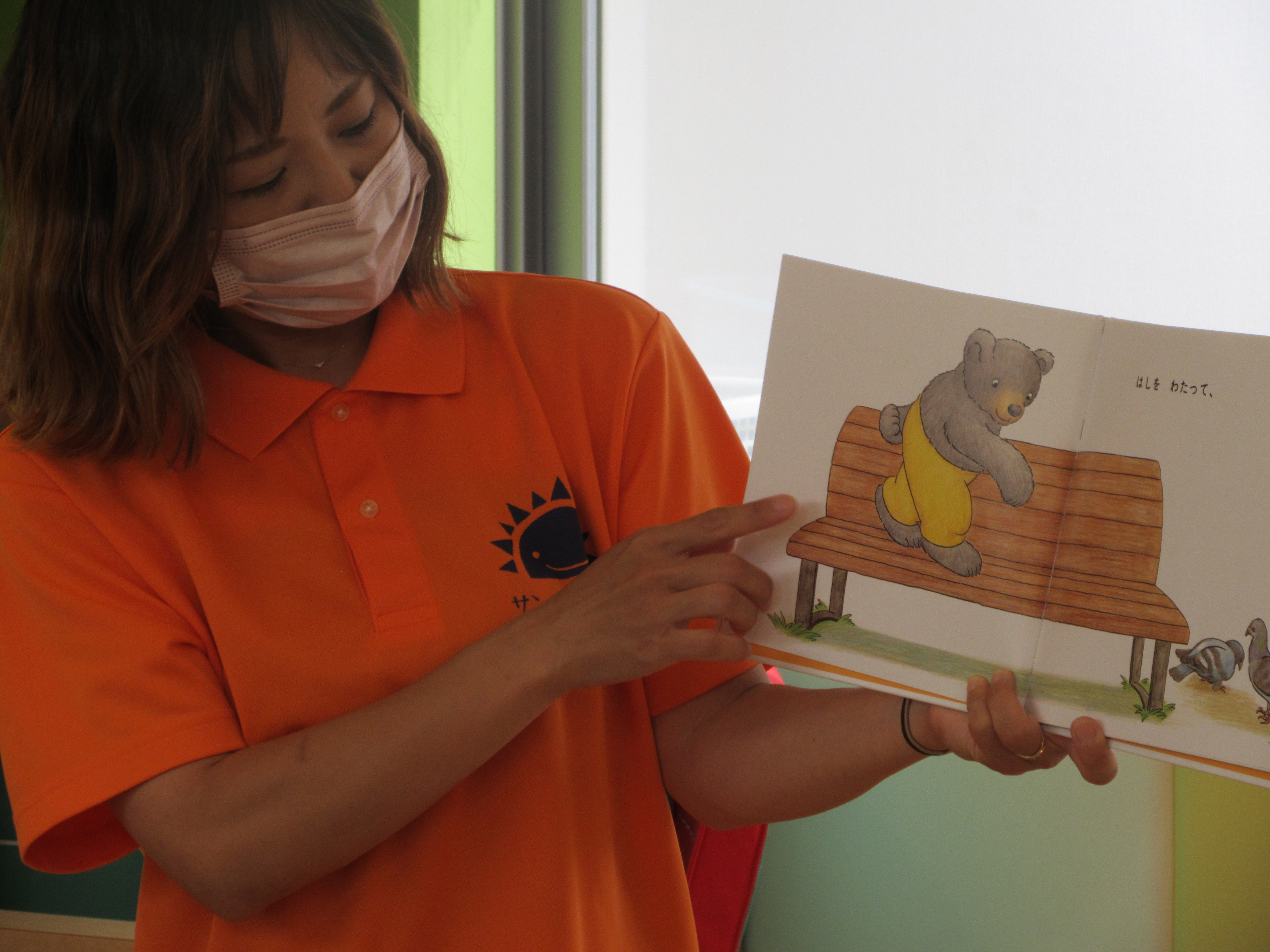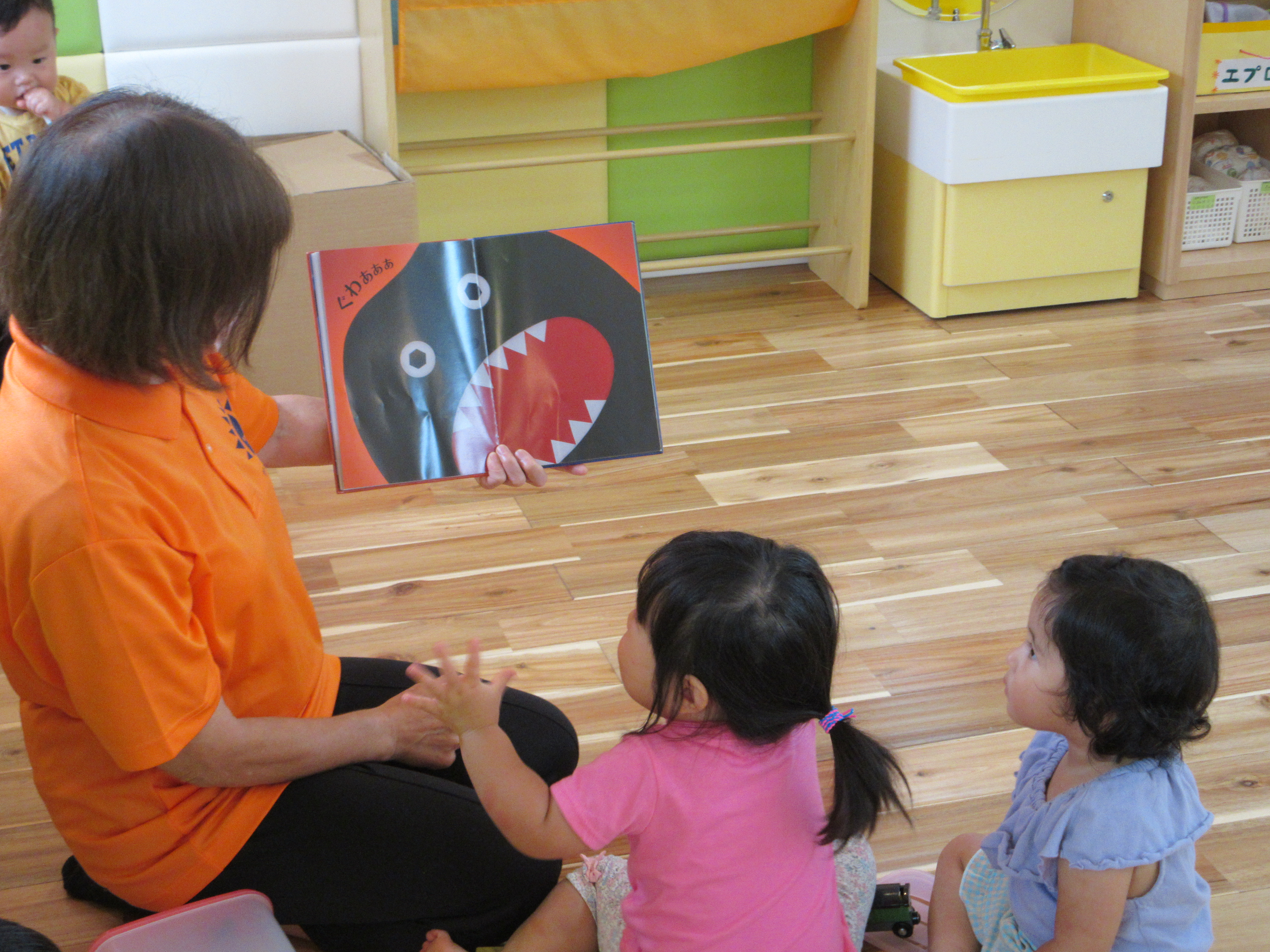 おやつ前の絵本タイム。子どもたちはじっと見入っていますね