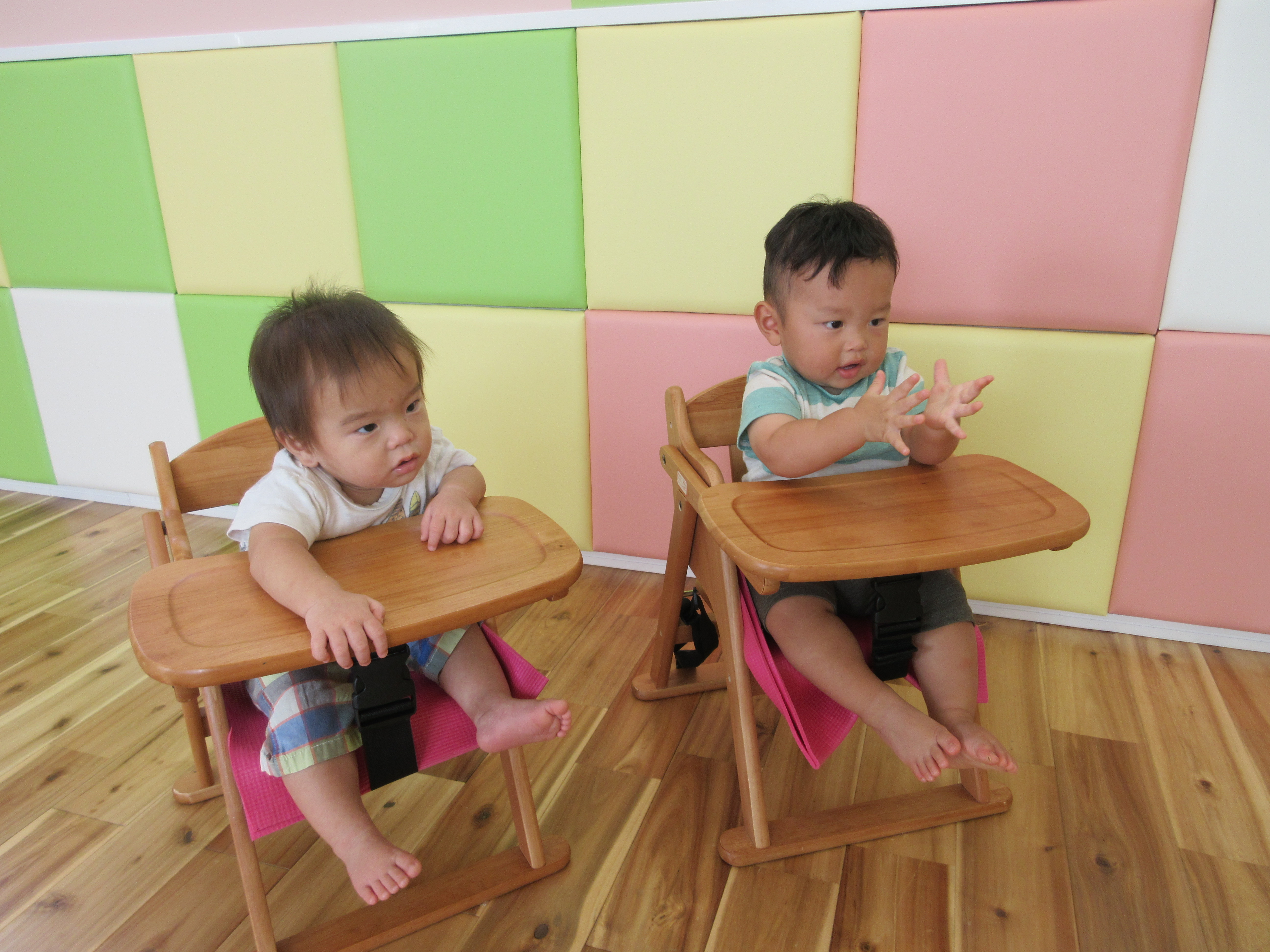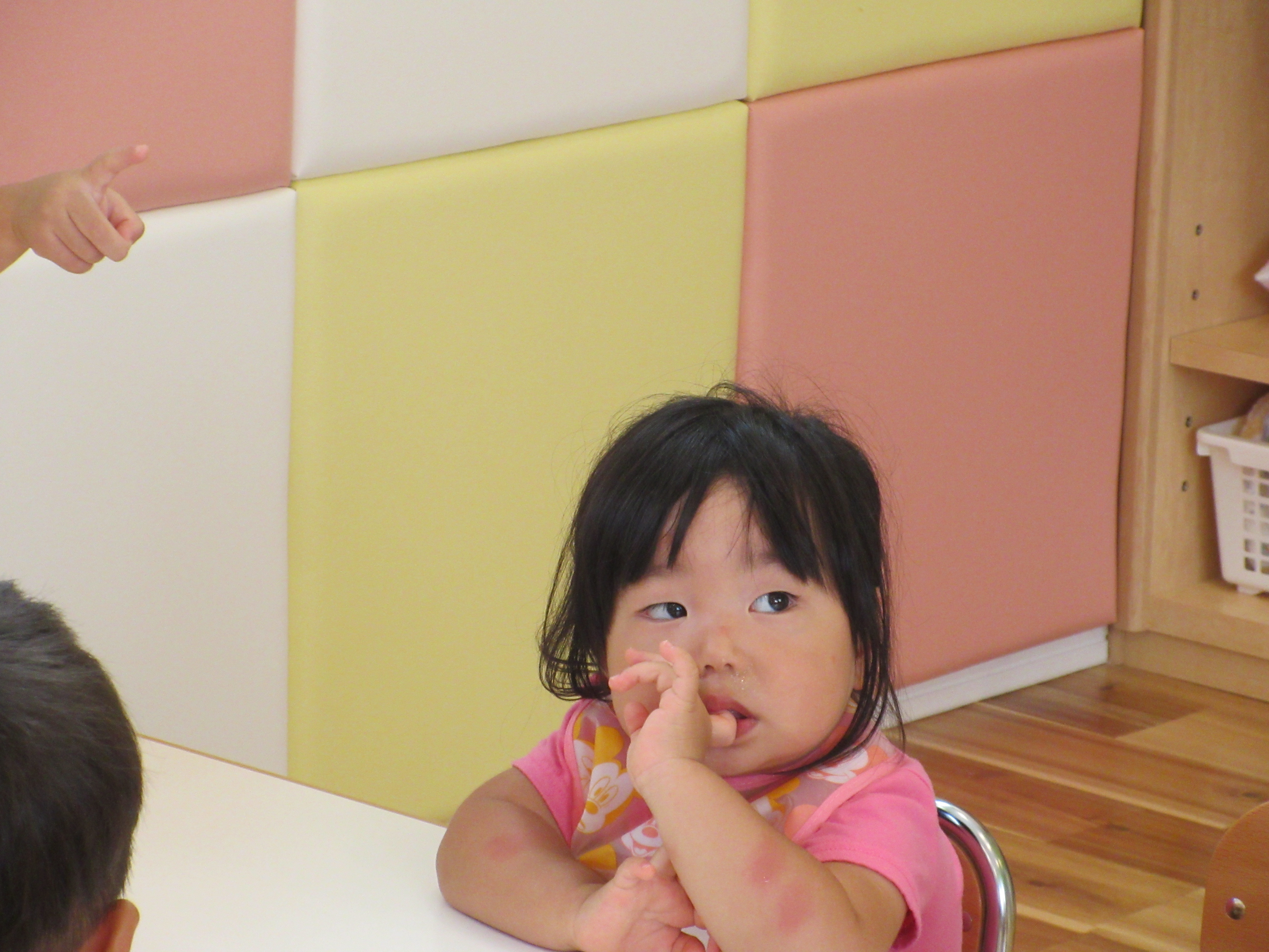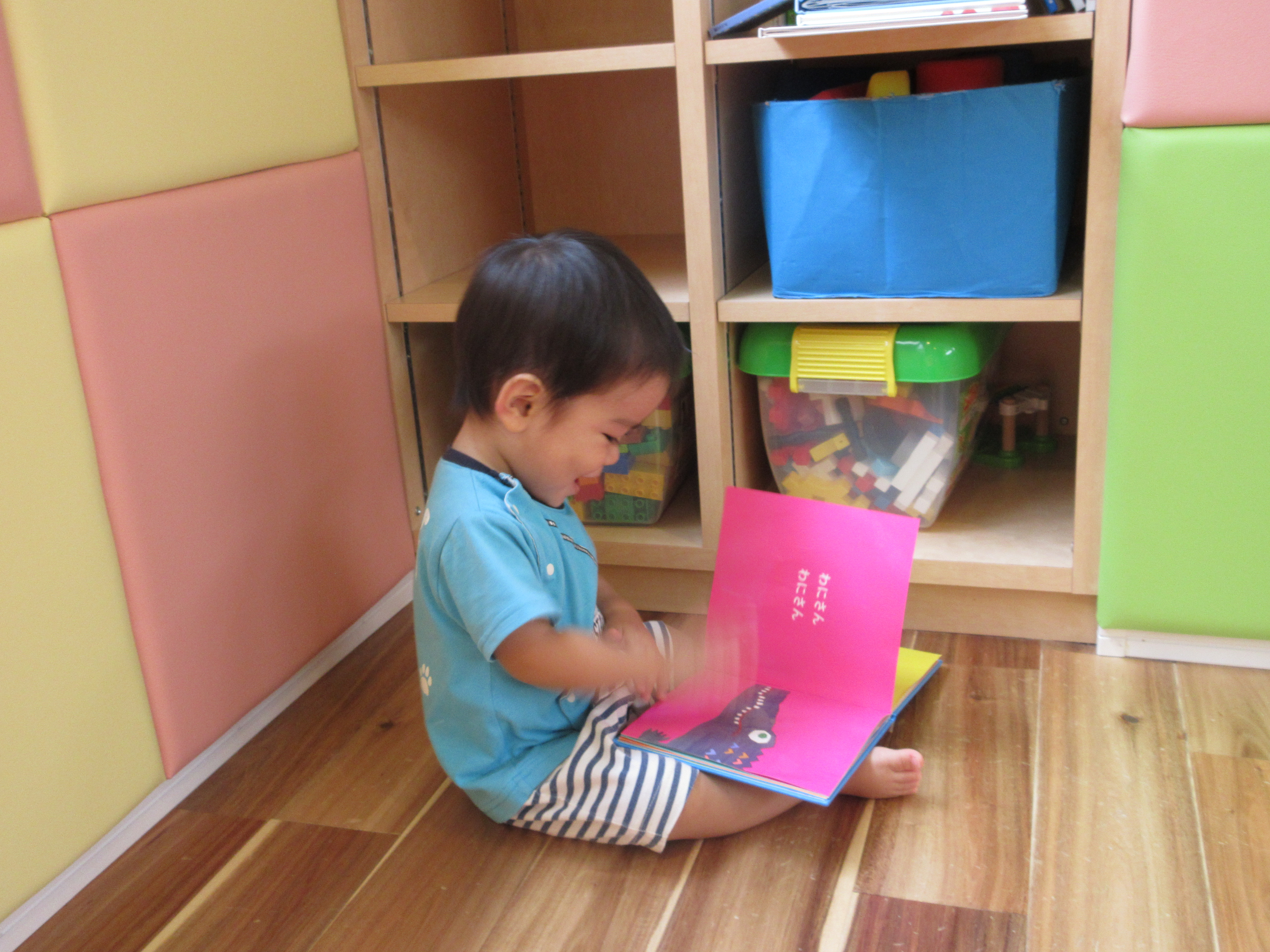おやつ前の絵本タイム。子どもたちはじっと見入っていますね