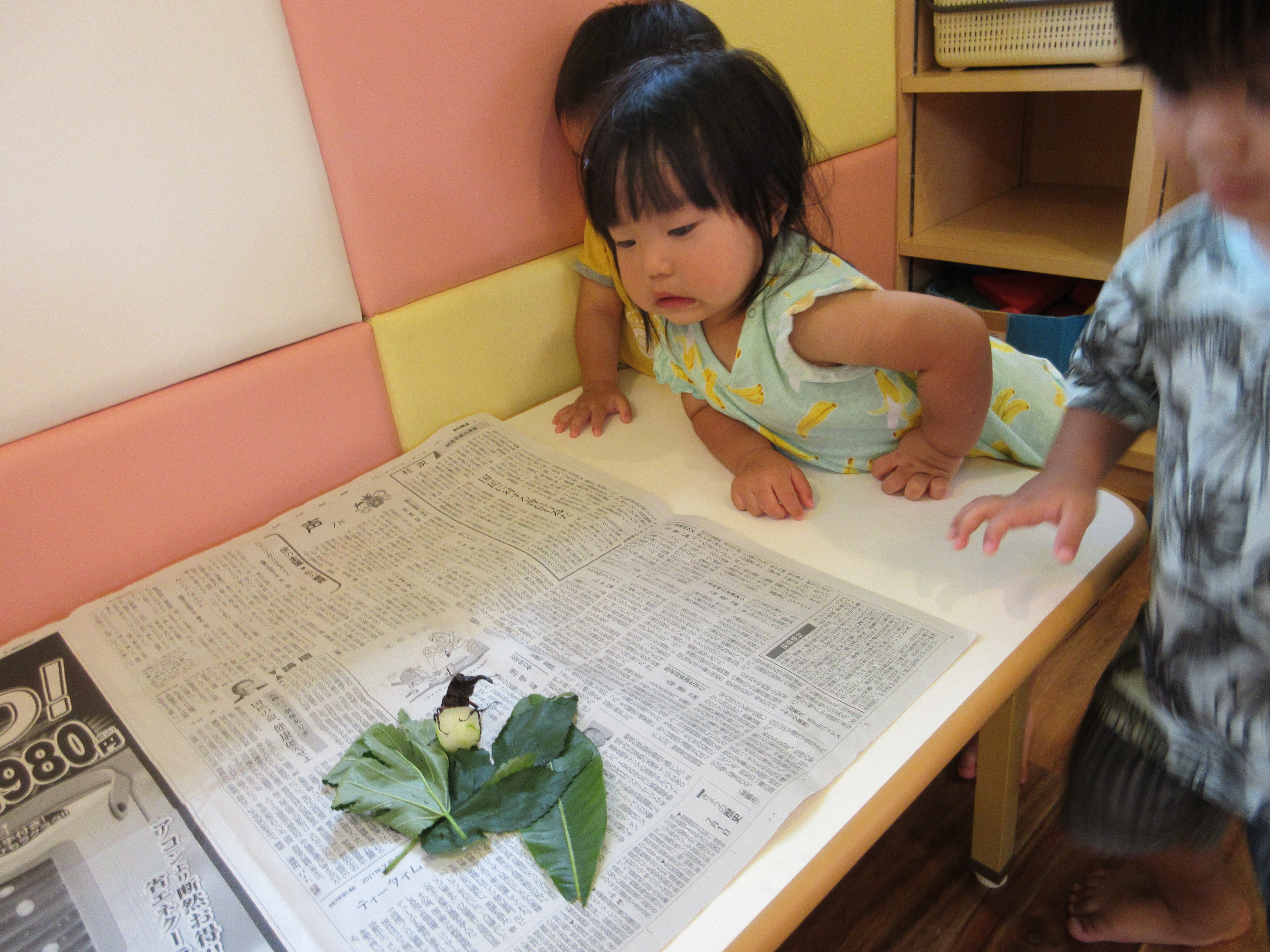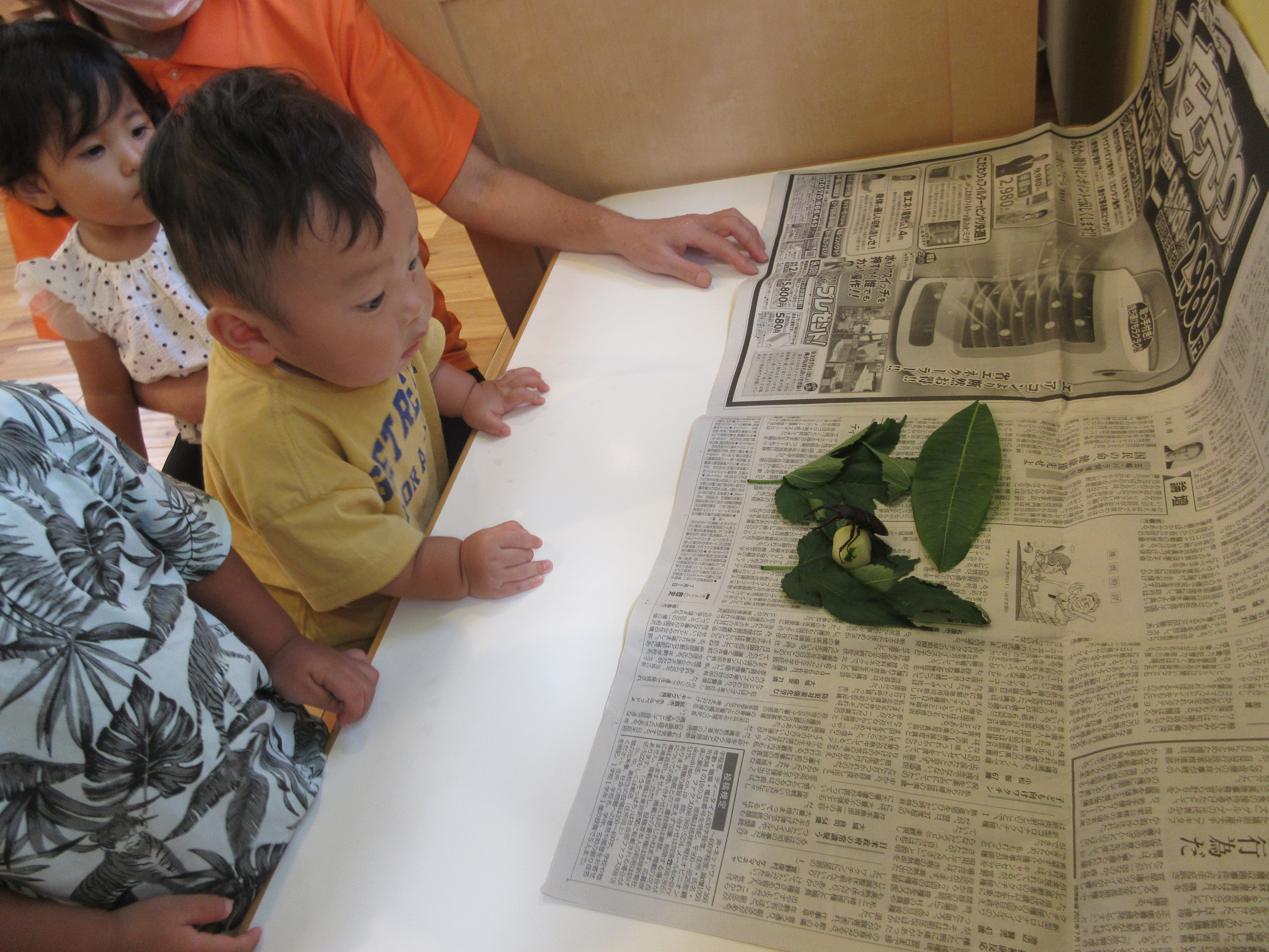 クワガタムシを保育士が見つけたとのことで持ってくると子どもたちは興味津々![]()