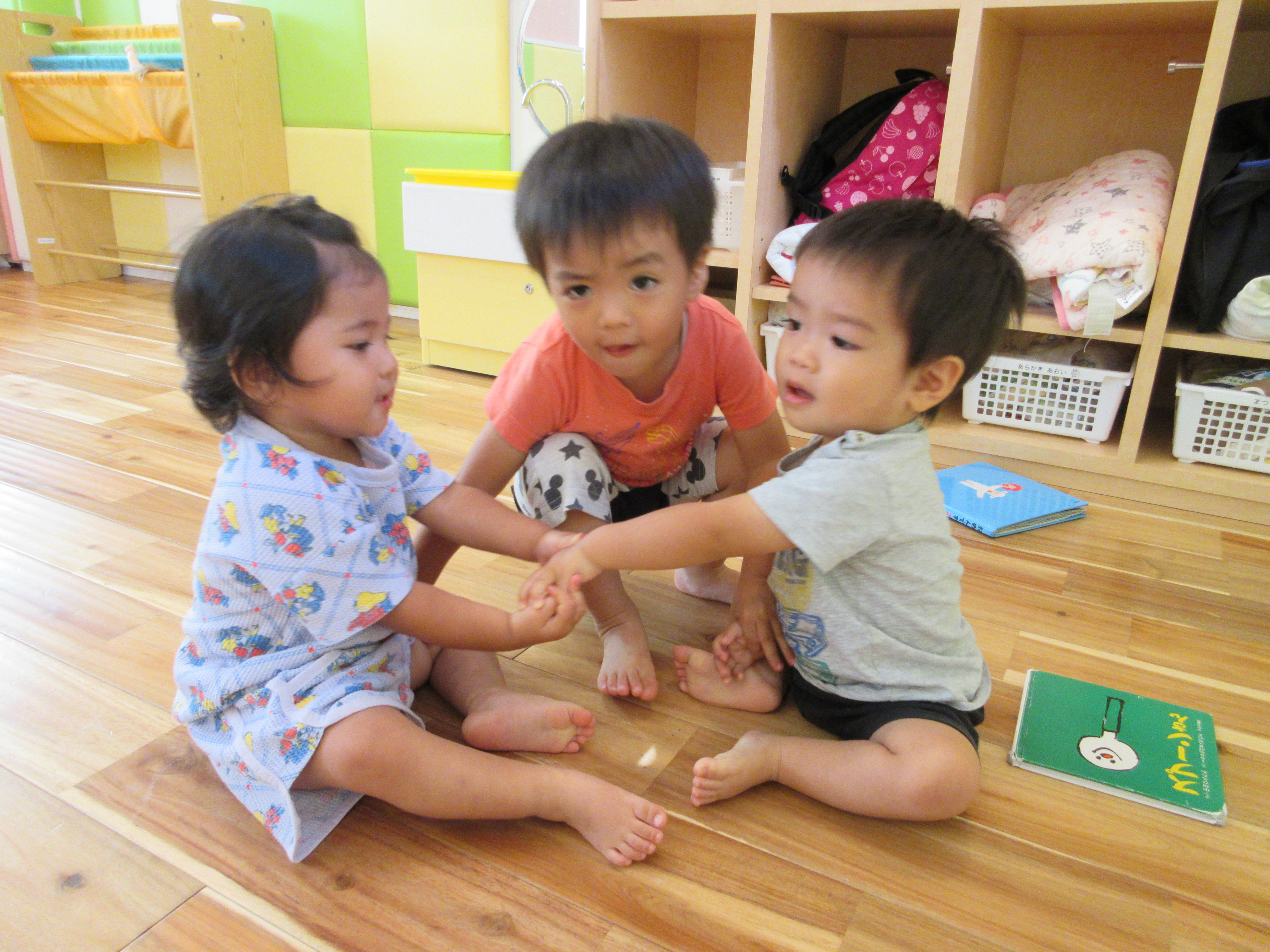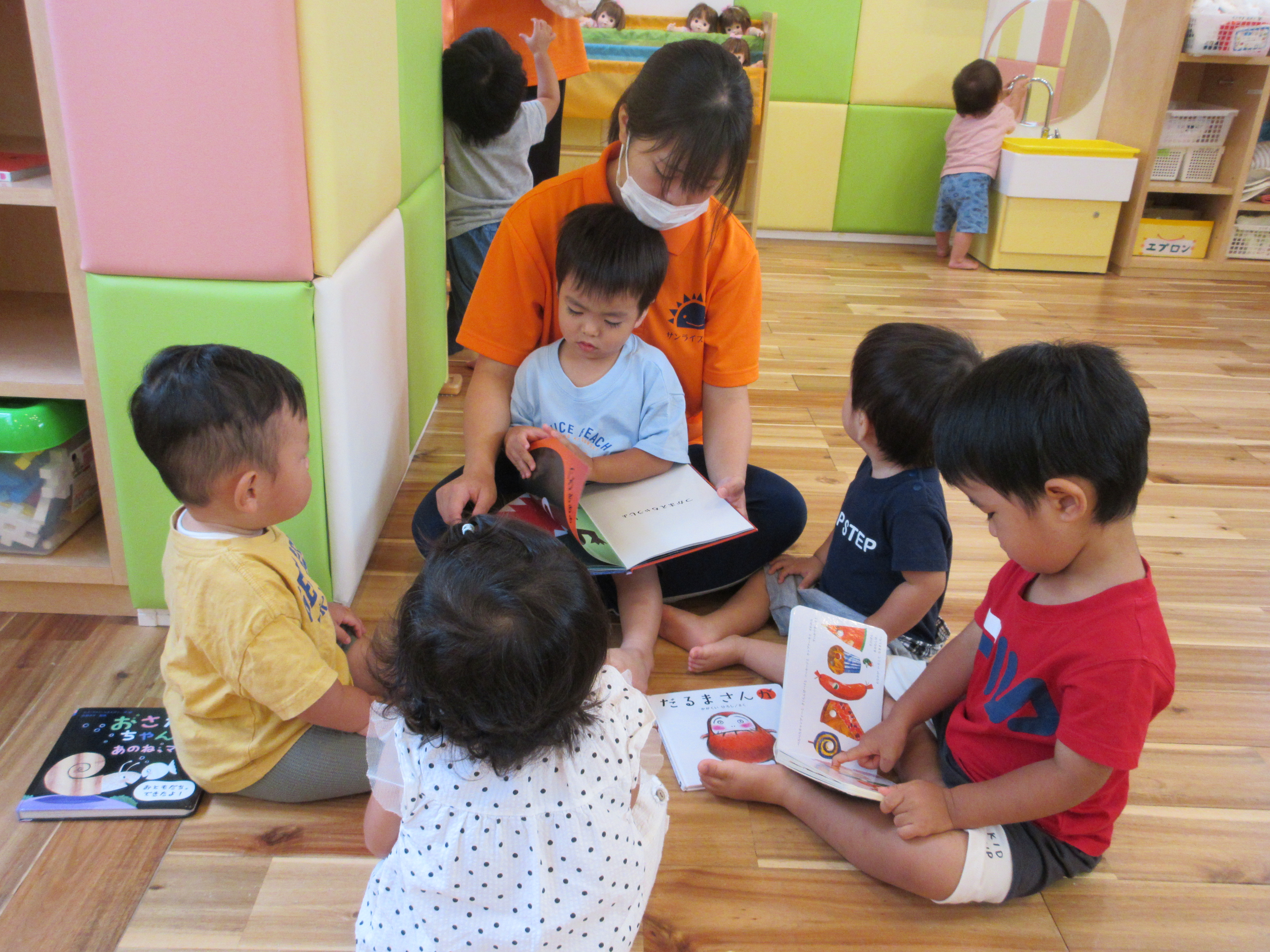 みんなで絵本を見るよ。
