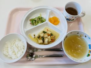 粥 豆腐の煮物 キャベツの煮浸し みかん缶