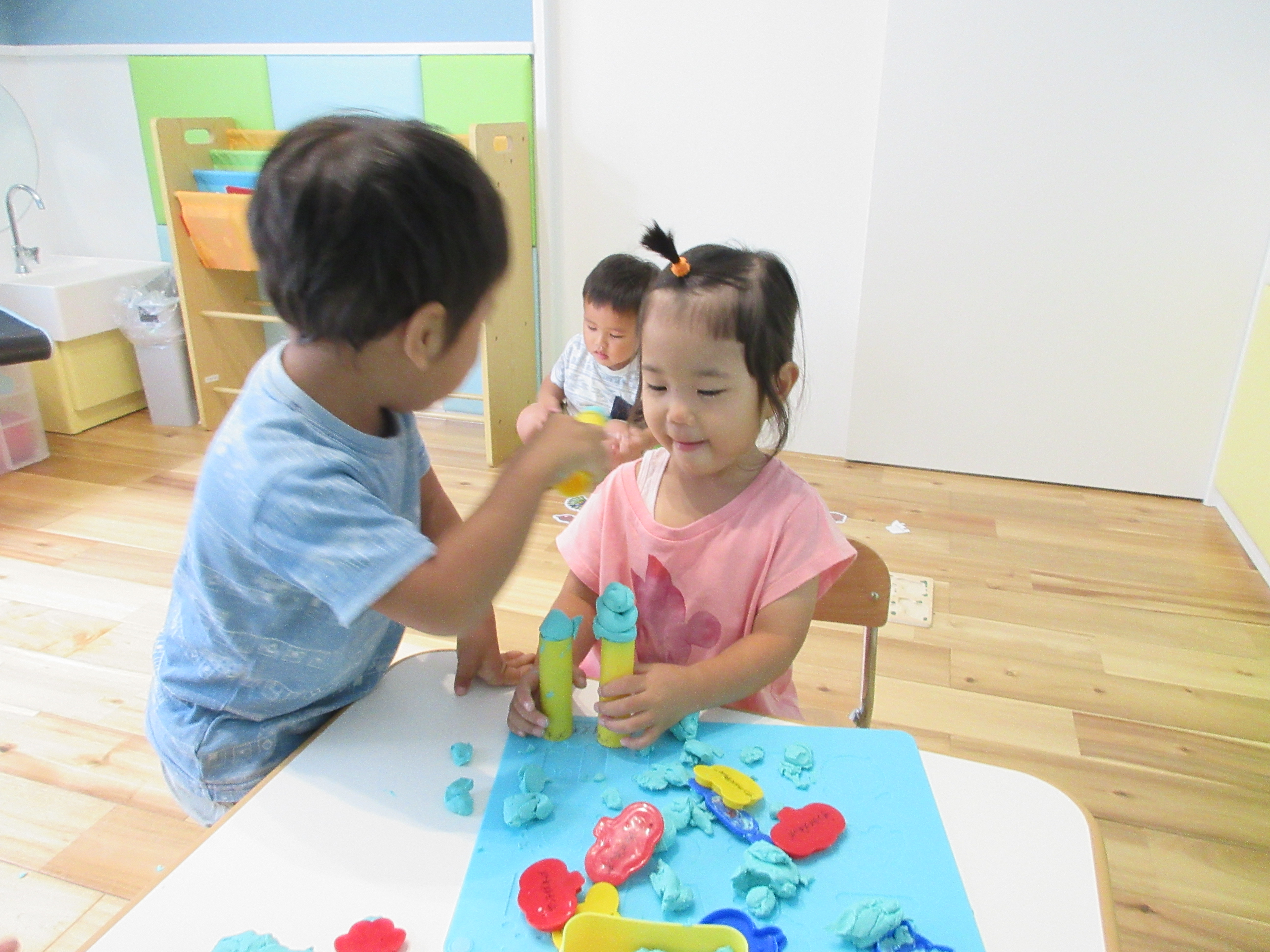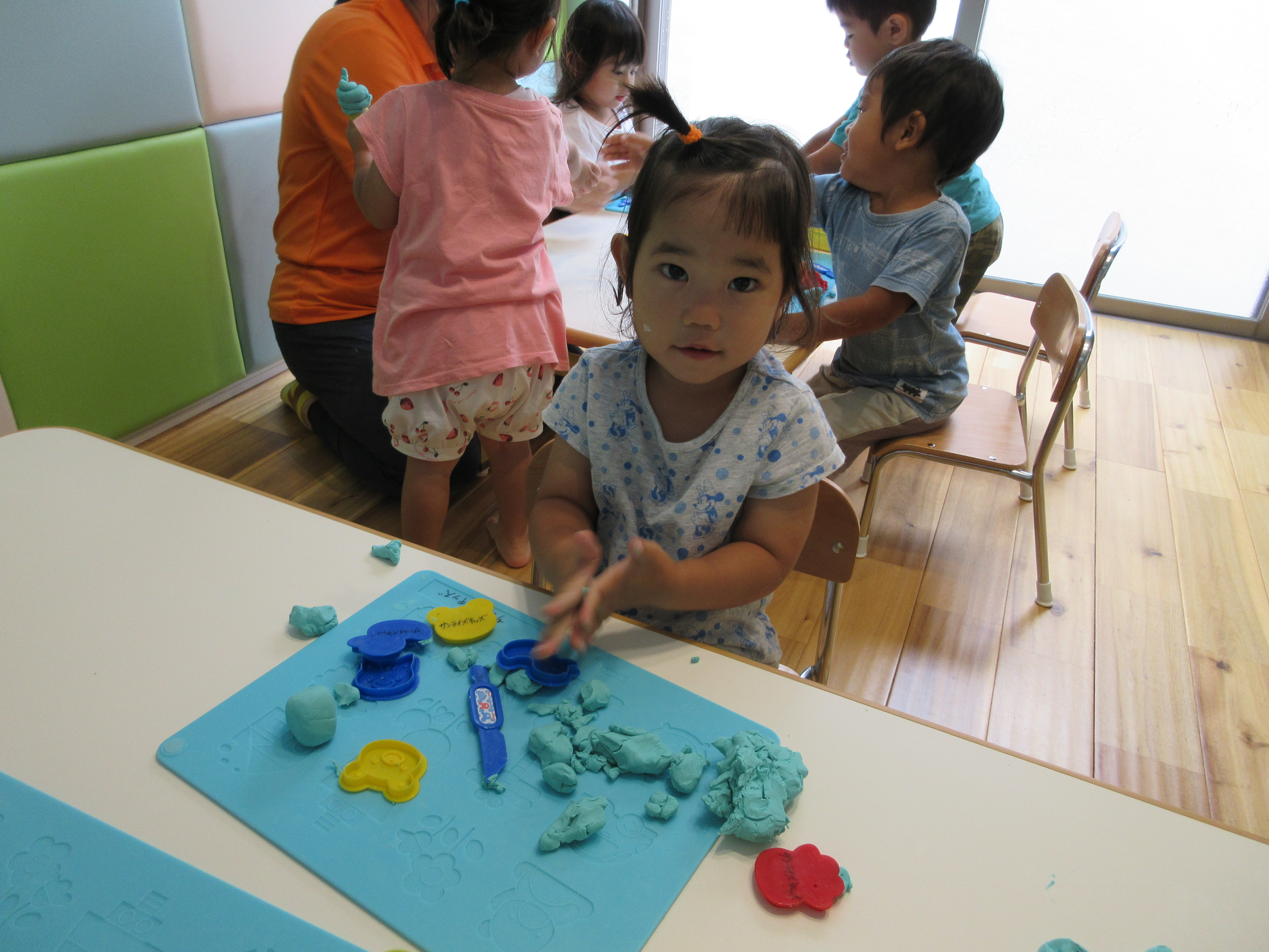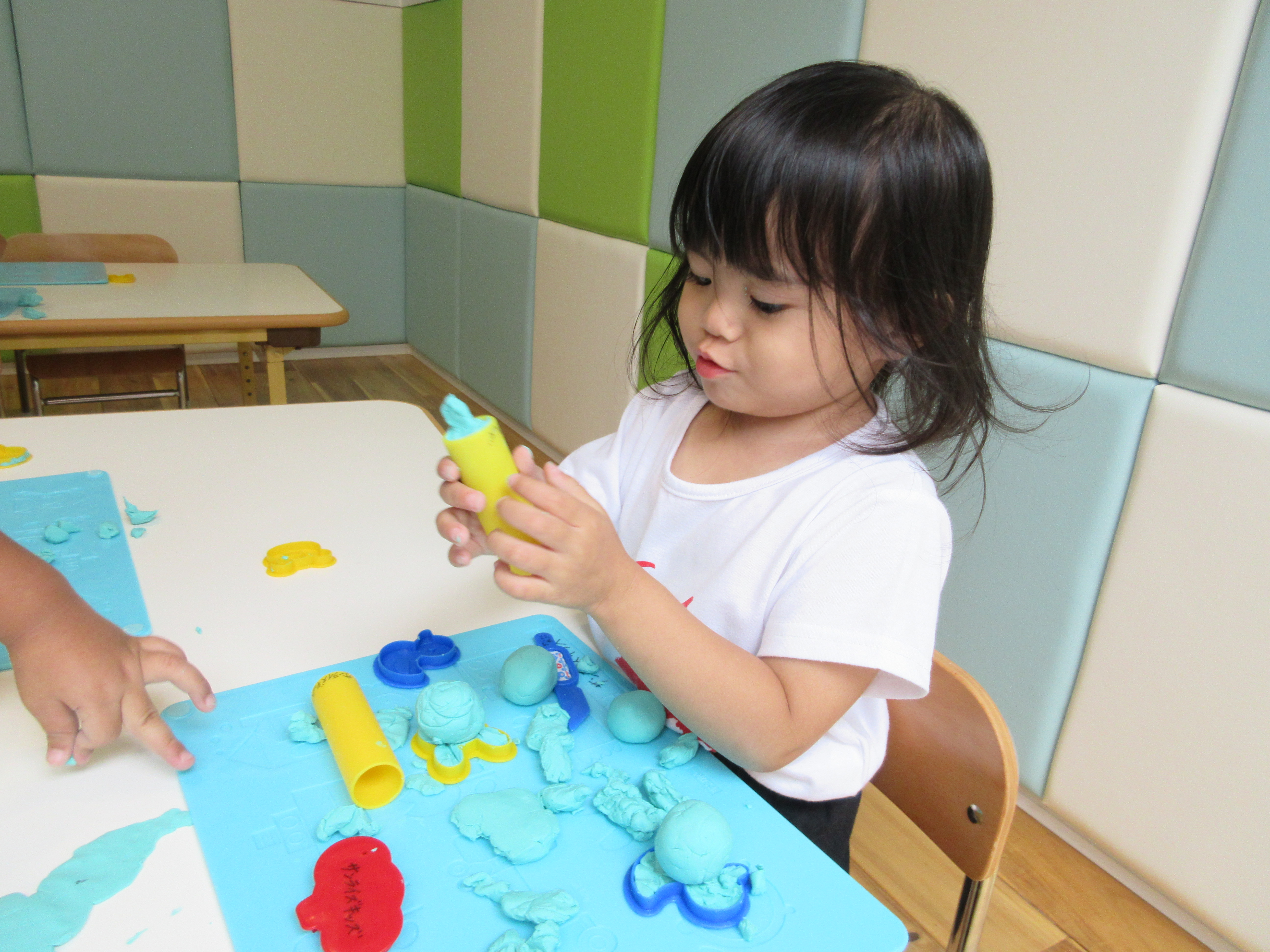 どうやって遊ぶのか、最初は戸惑っていたお友達も、段々と手の平で粘土をこねだしましたよ![]()