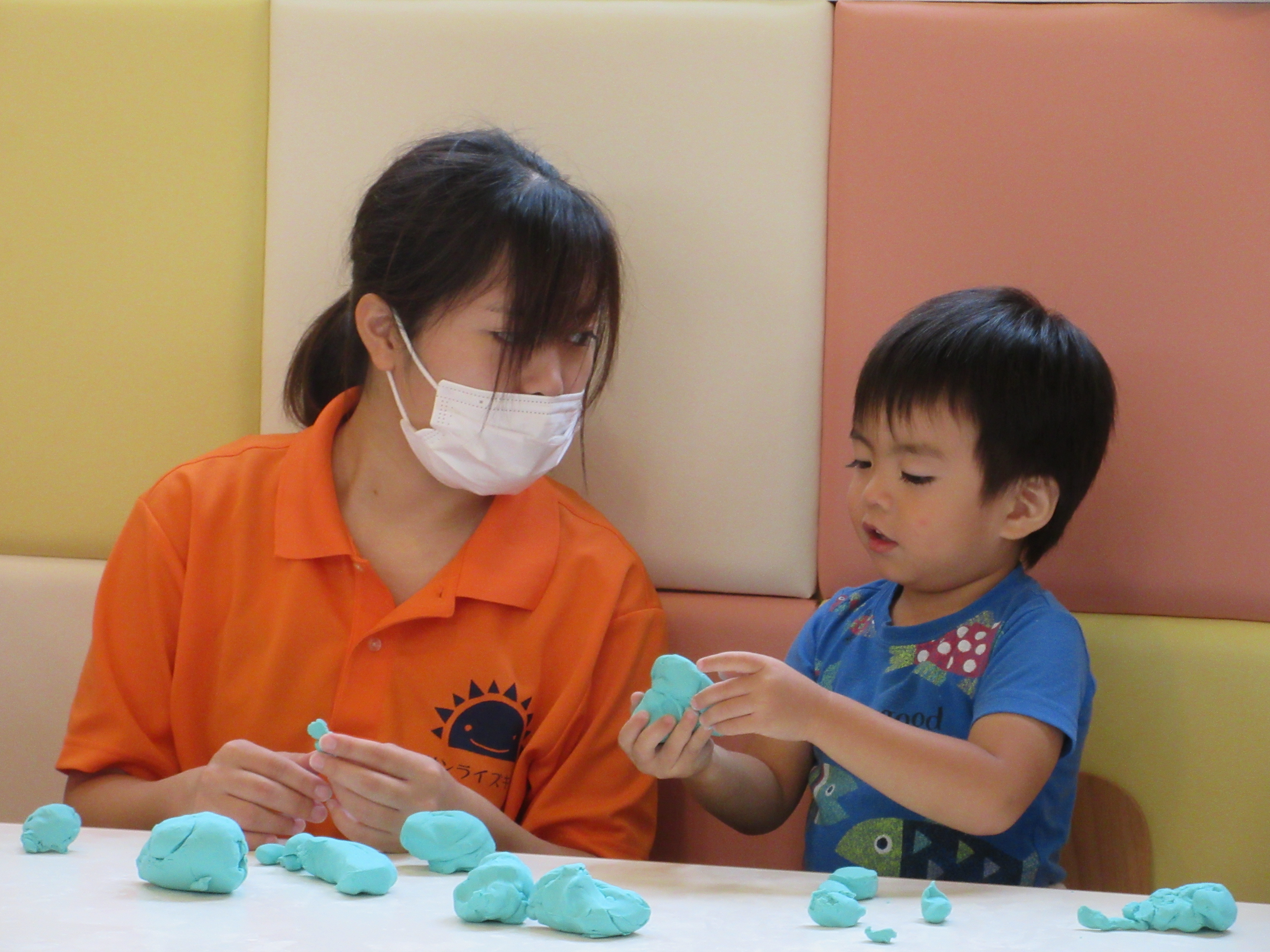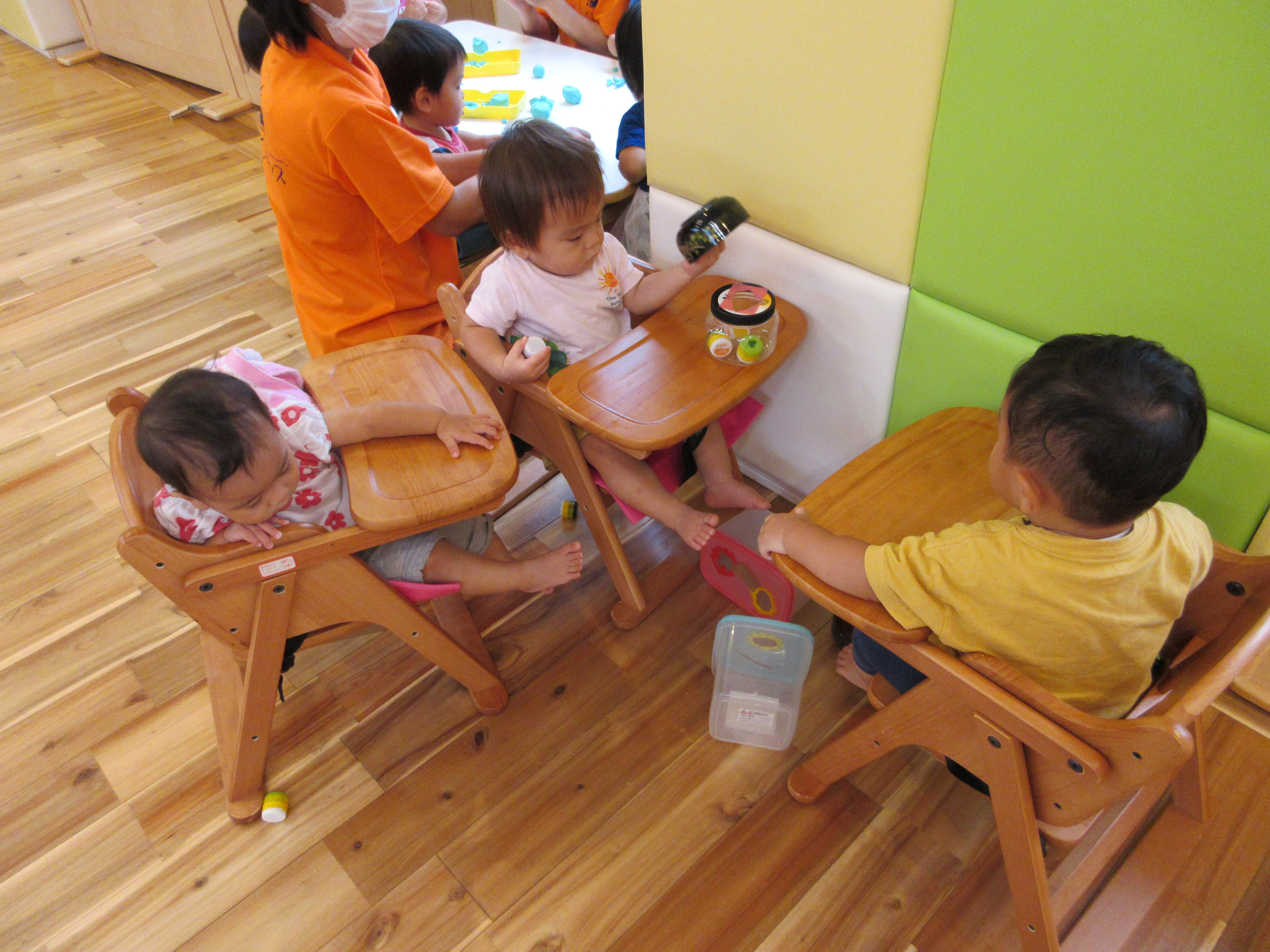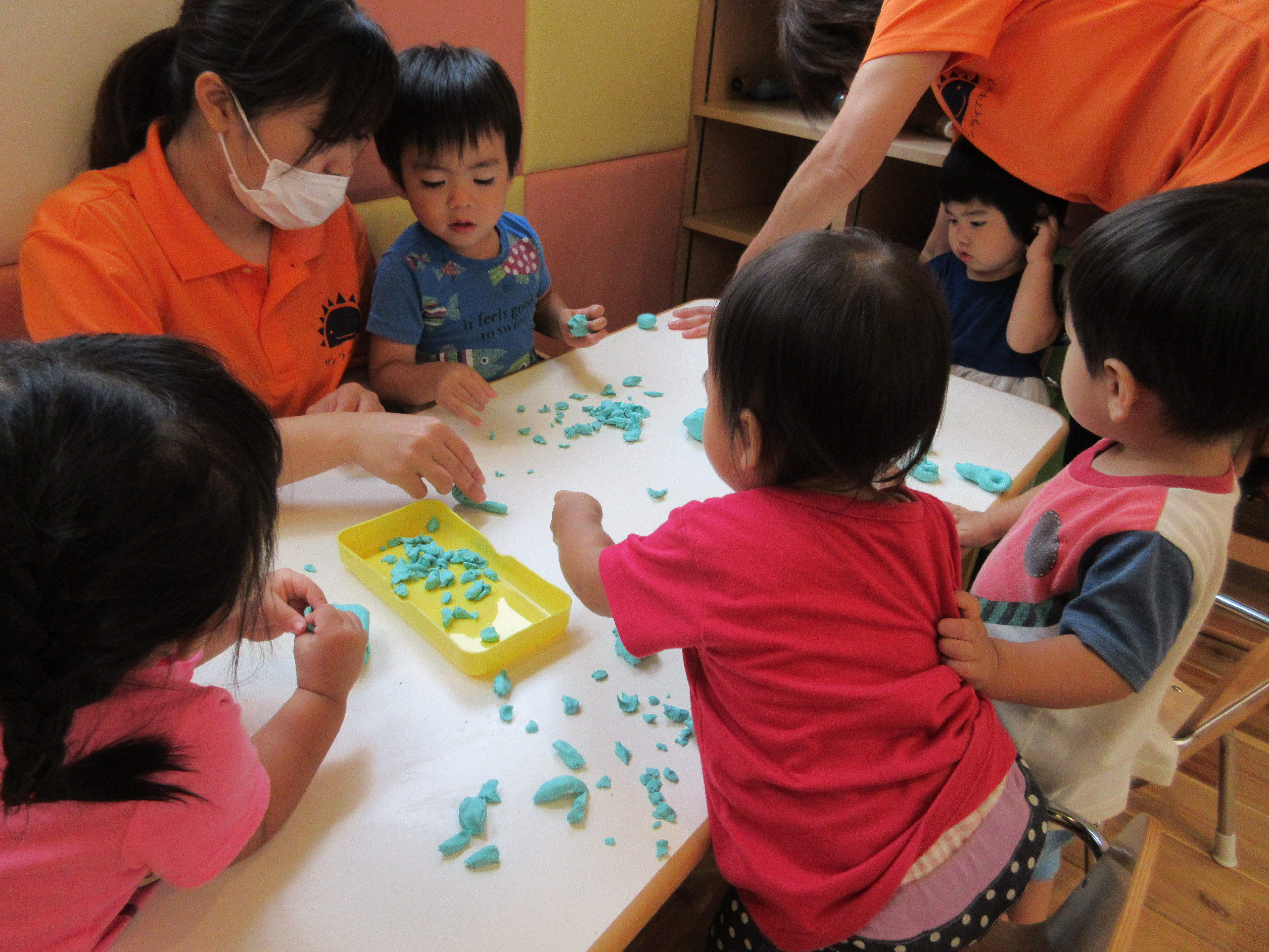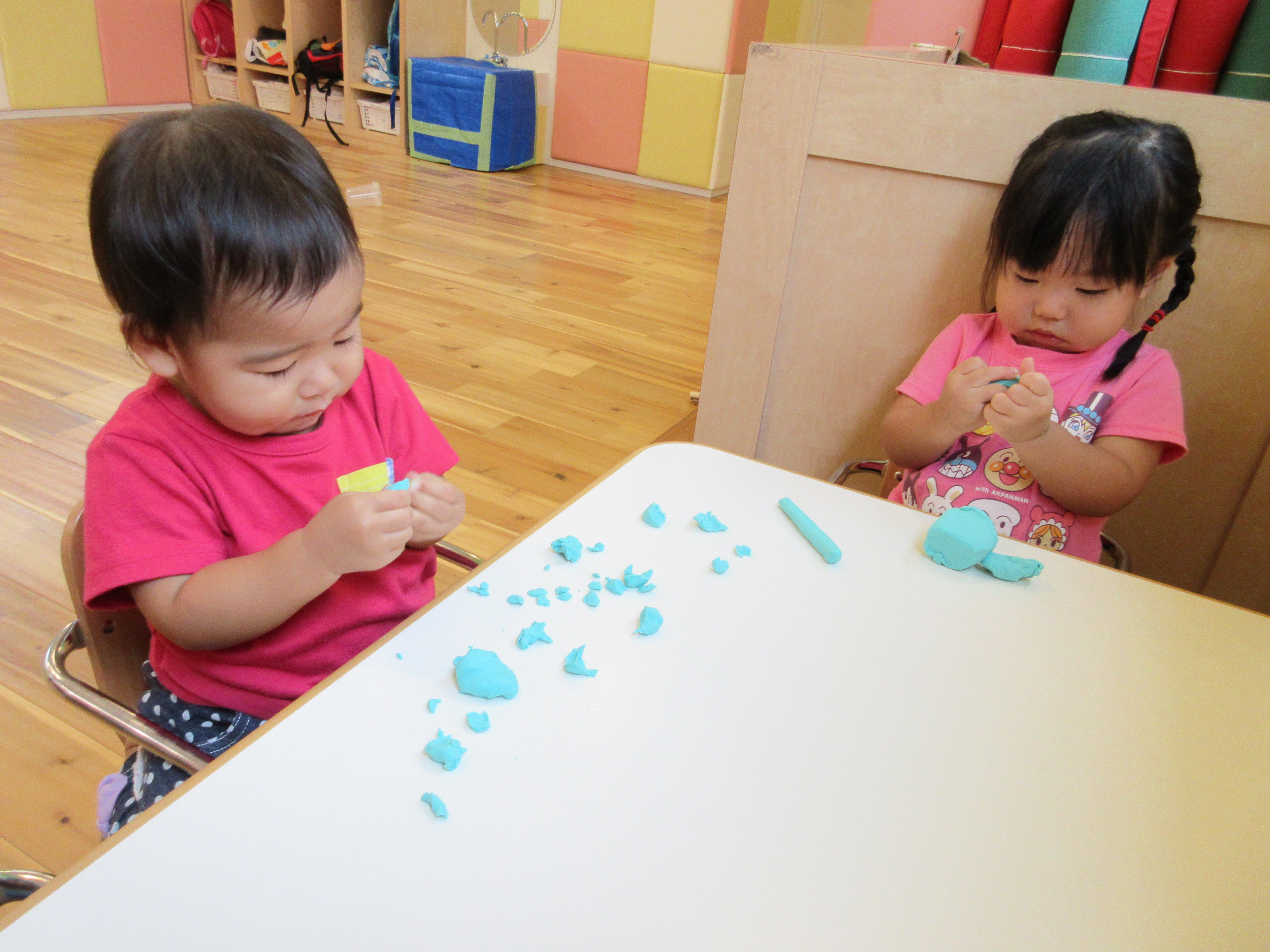 どうやって遊ぶのか、最初は戸惑っていたお友達も、段々と手の平で粘土をこねだしましたよ![]()