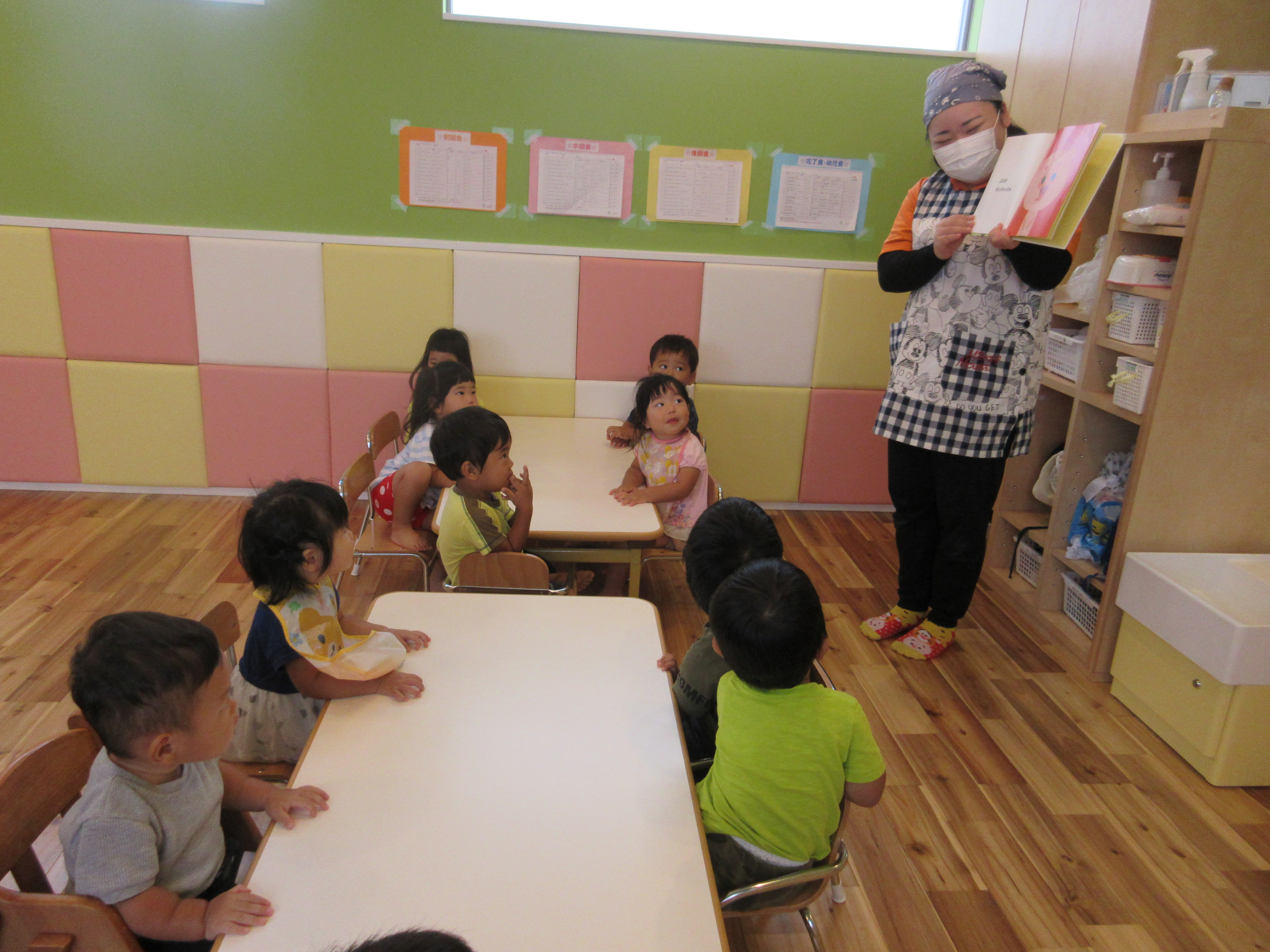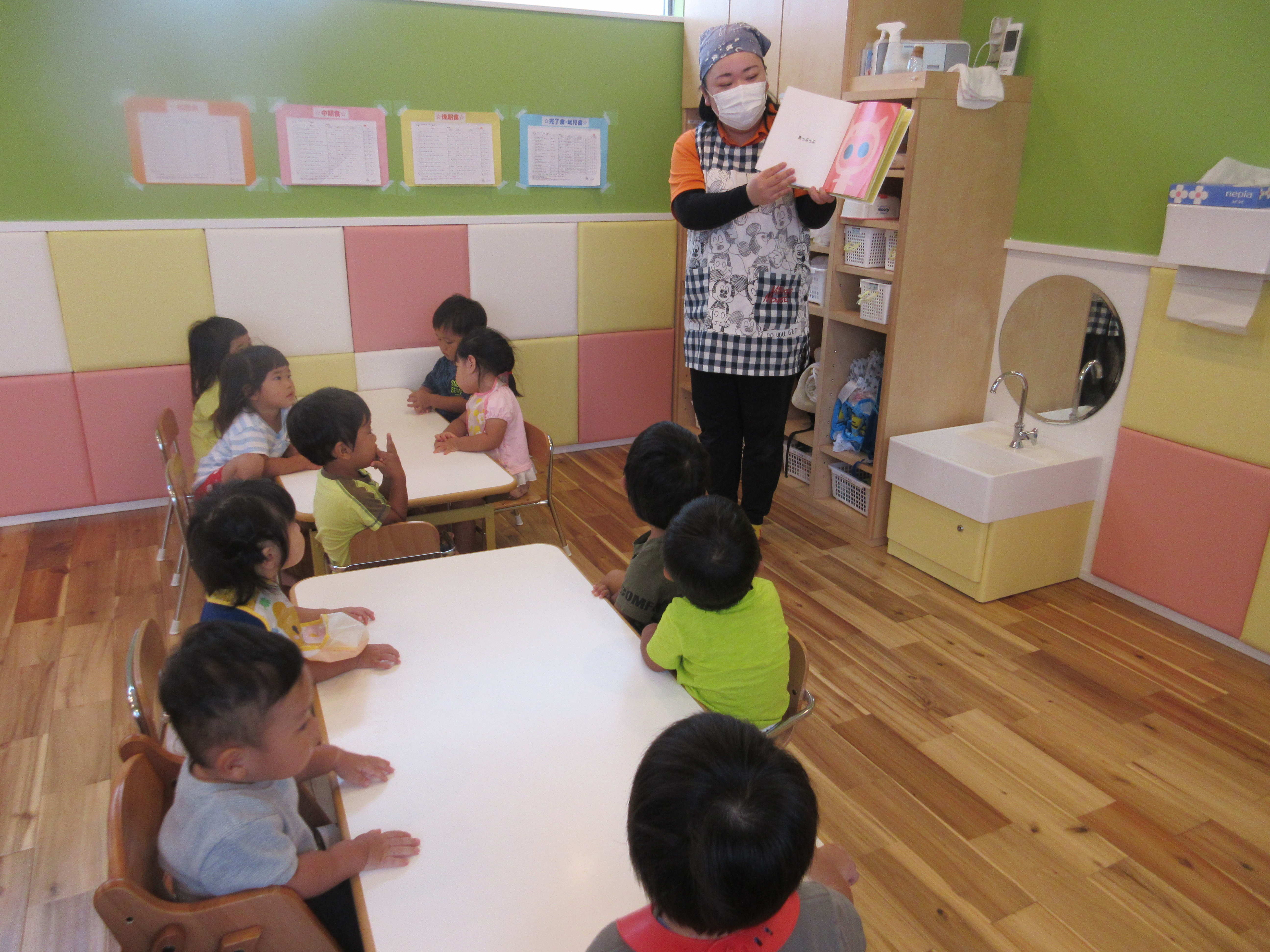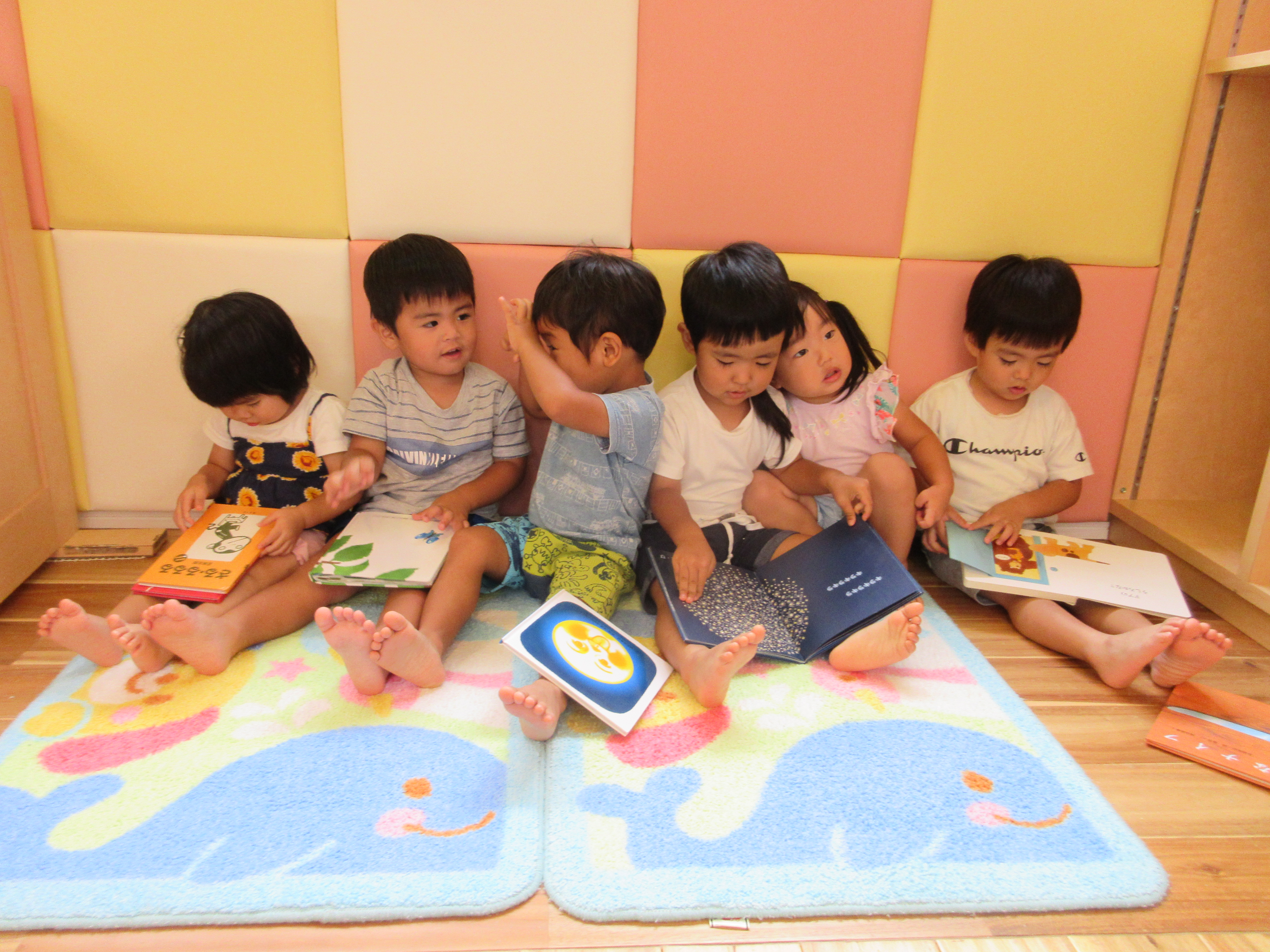 保育園では先生たちが絵本をたくさん読んでくれますが、絵本の時間以外でも、子どもたちは自由に絵本を手に取り楽しんでいますよ![]()