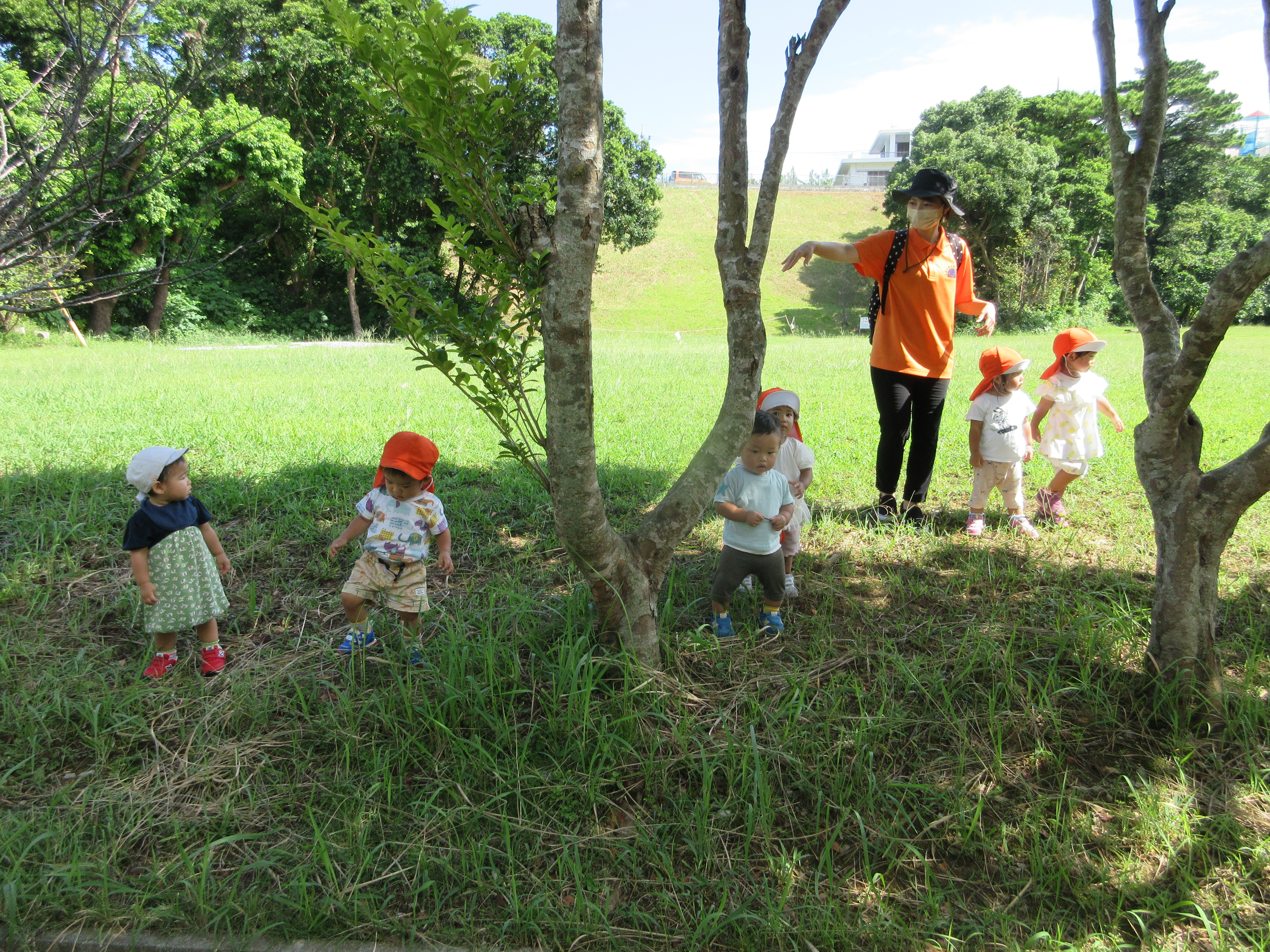 「来るとき雨降ってた~」「お散歩いけるかなぁ…」と心配そうな声も聞かれましたが、雨降りの中の登園でも、お散歩に行く時間には、とっても良いお天気に!