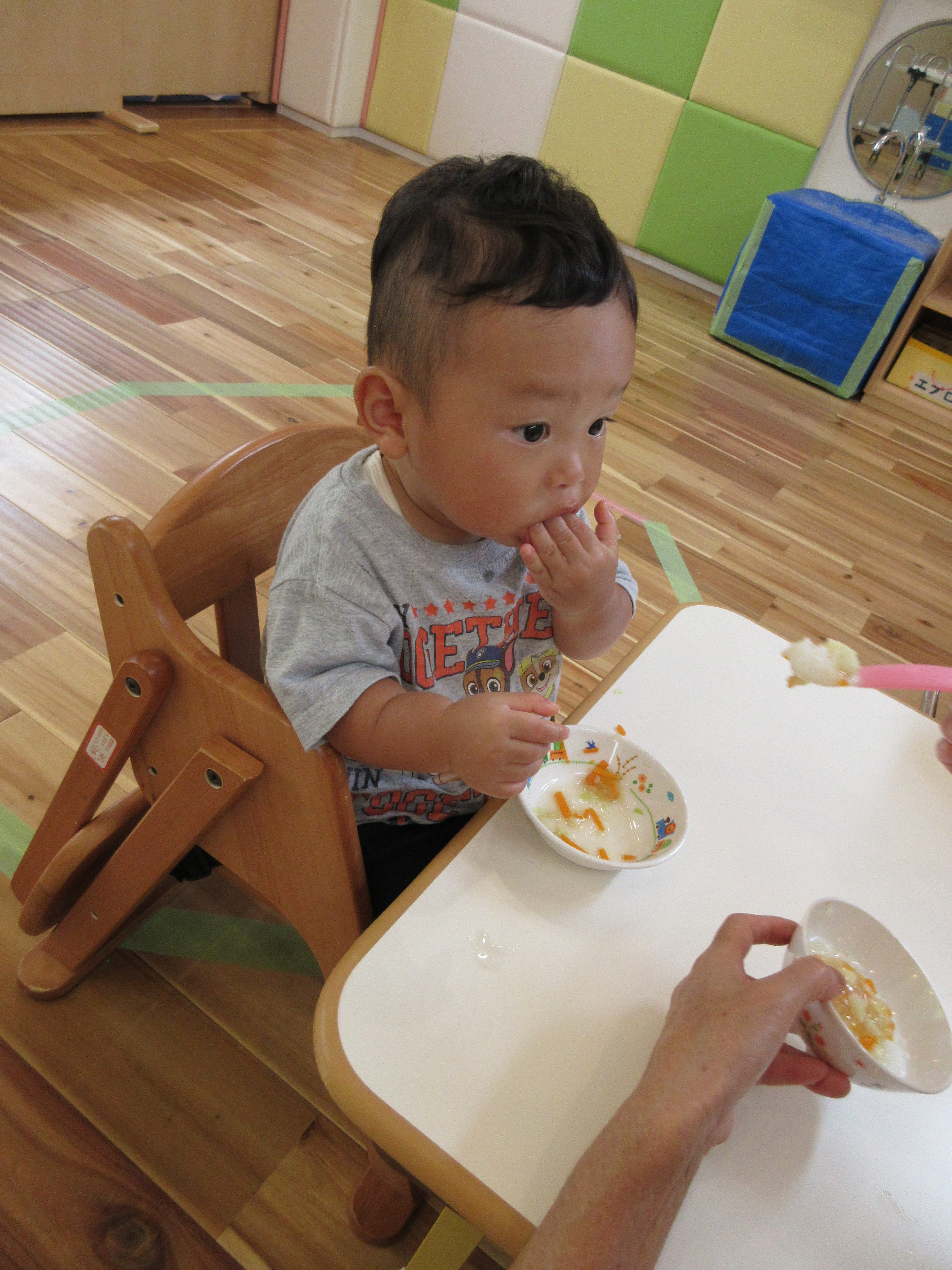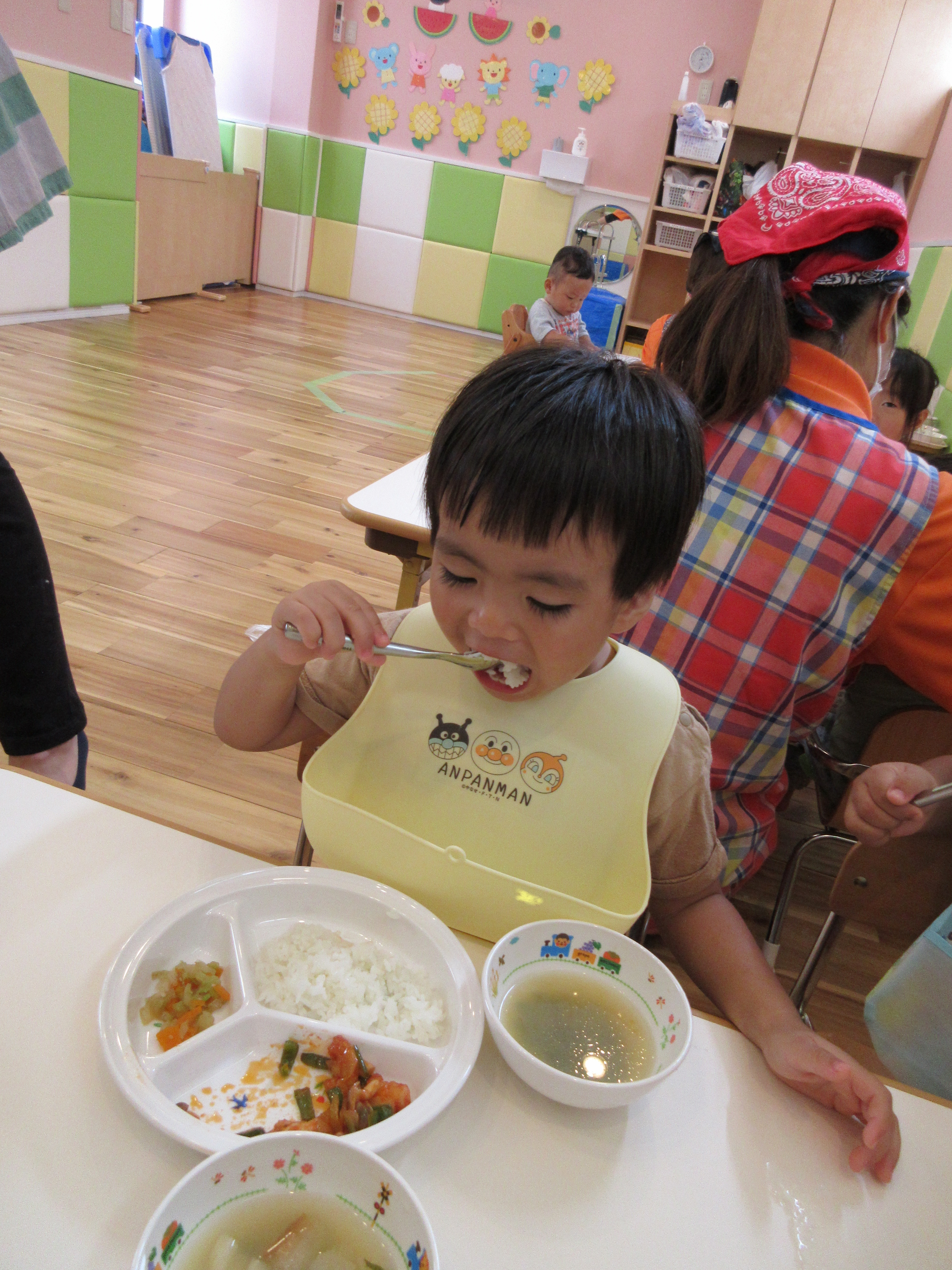 たくさん遊んだ後は、お腹がぺこぺこ。おかわりするお友達もいますよ!