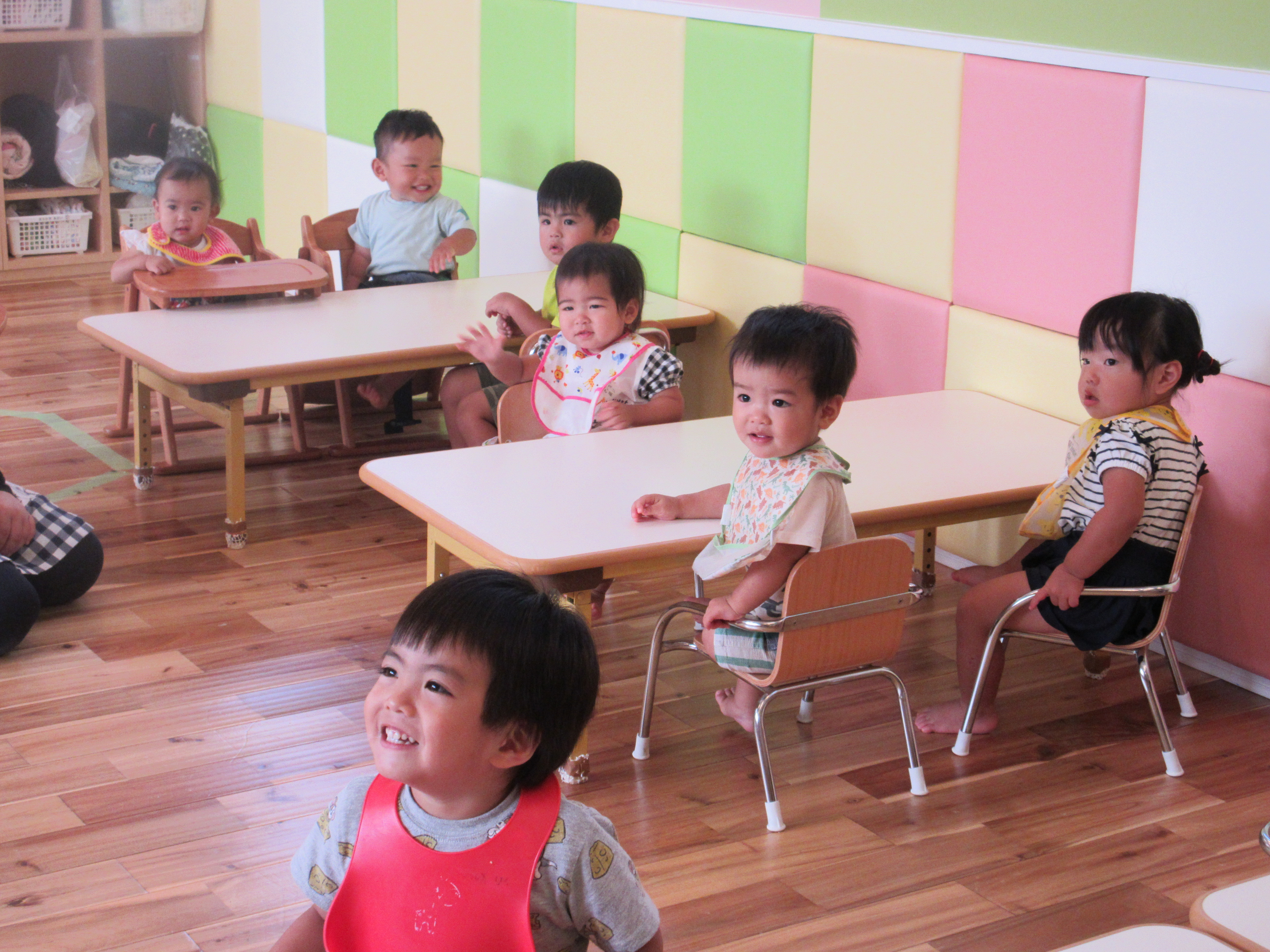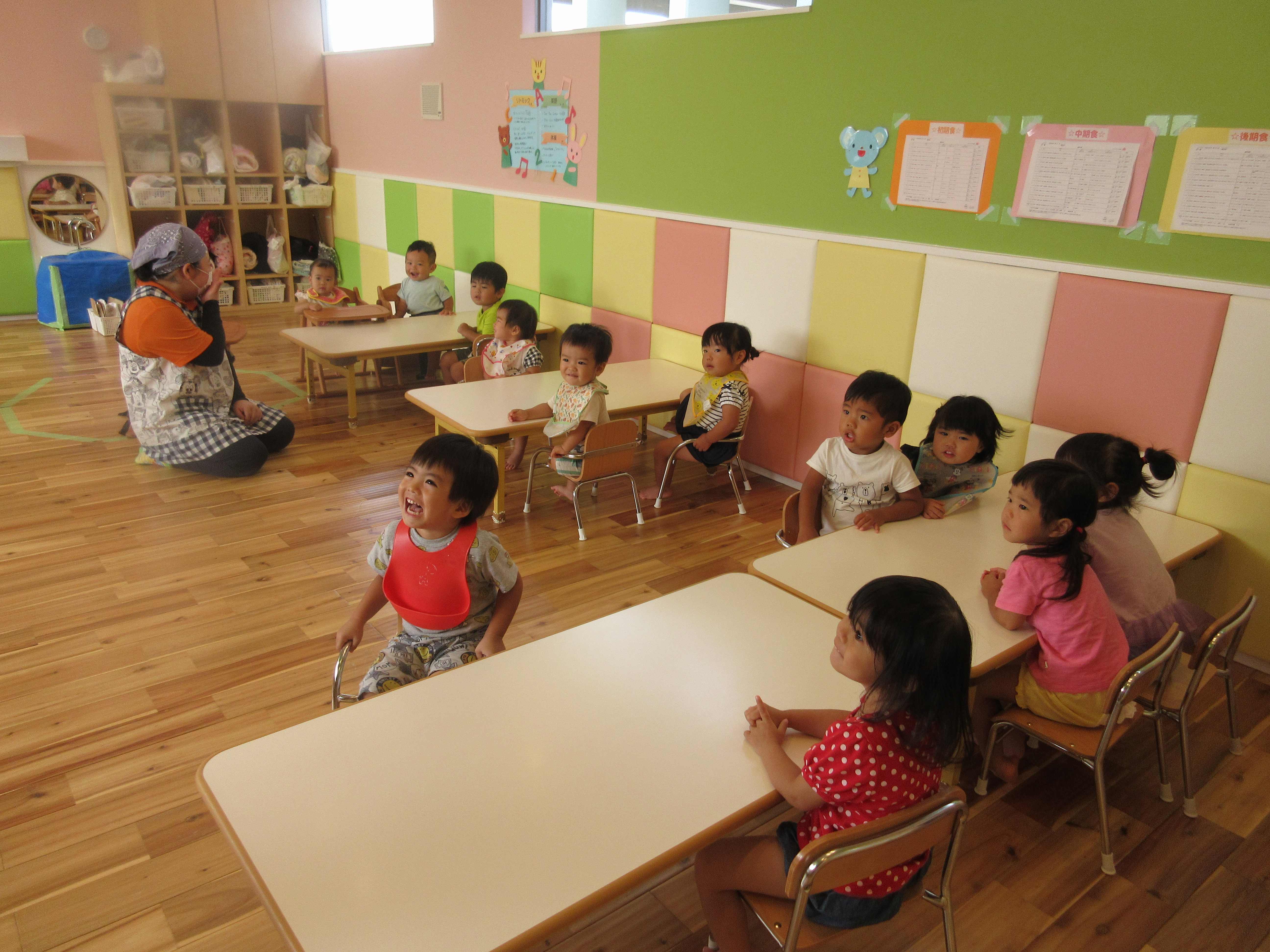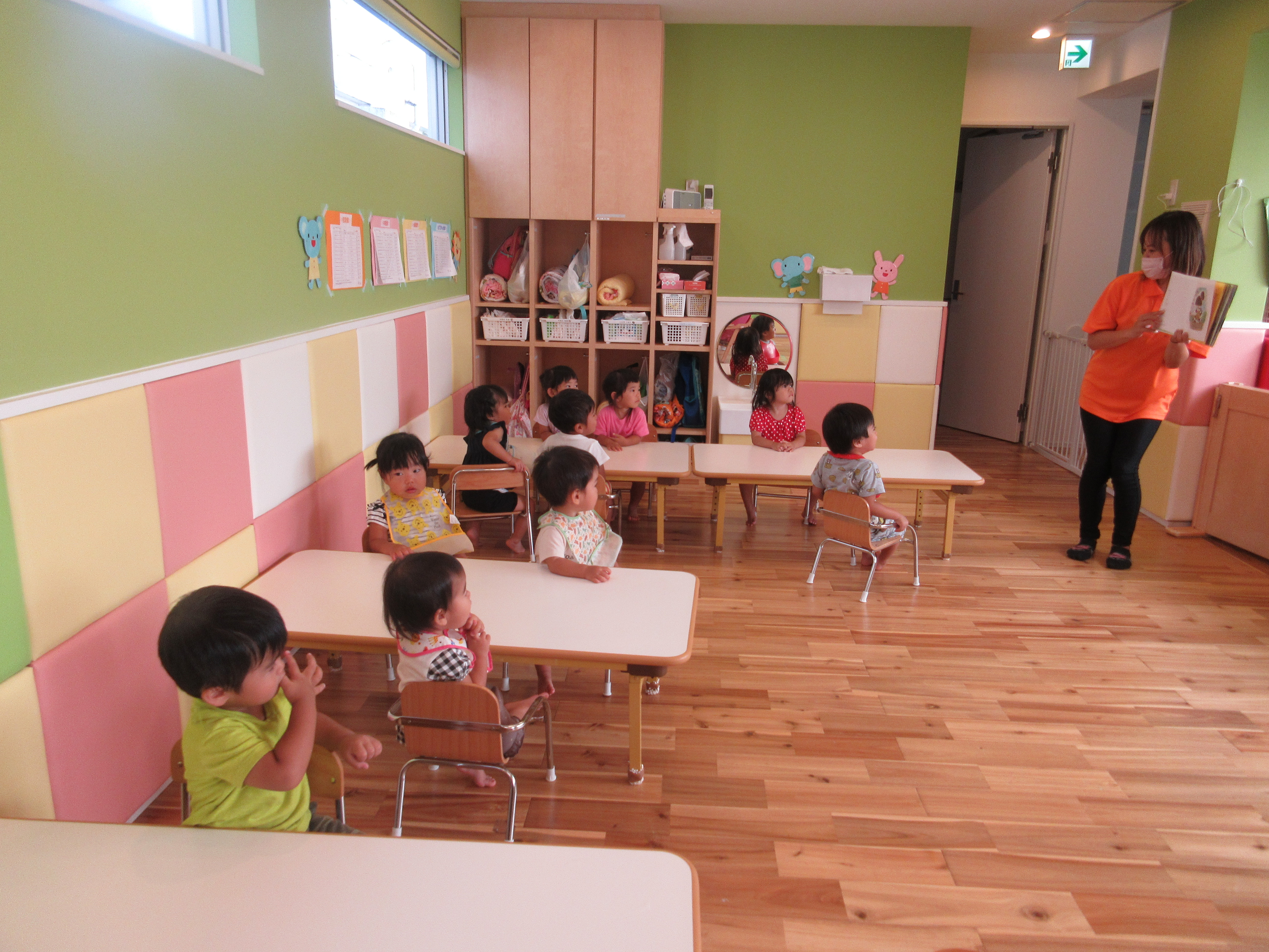 言葉遊びのような内容にすっかり引き込まれ、「ぺ!」「び!」など、先生の後に続いて言う姿も見られましたよ![]()